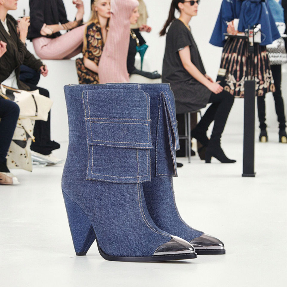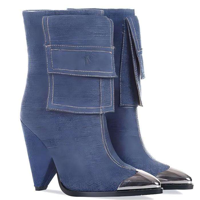Bottines en jean à talons compensés uniques pour femmes, chaussons courts en denim bleu à la mode avec bout pointu en métal pour l'hiver