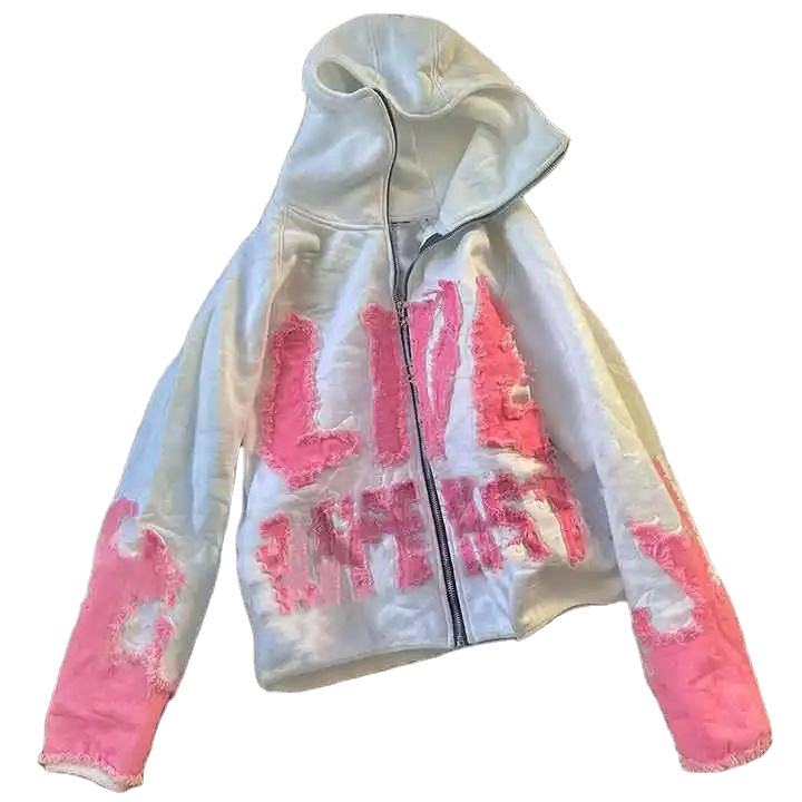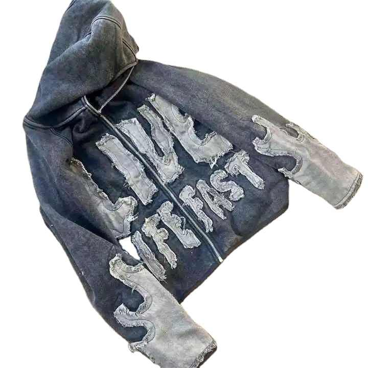 Style Unique Broderie Patchwork Distressed Applique Patch Singe Acide Lavage Personnalisé Graphique Zipper Vintage Hoodie