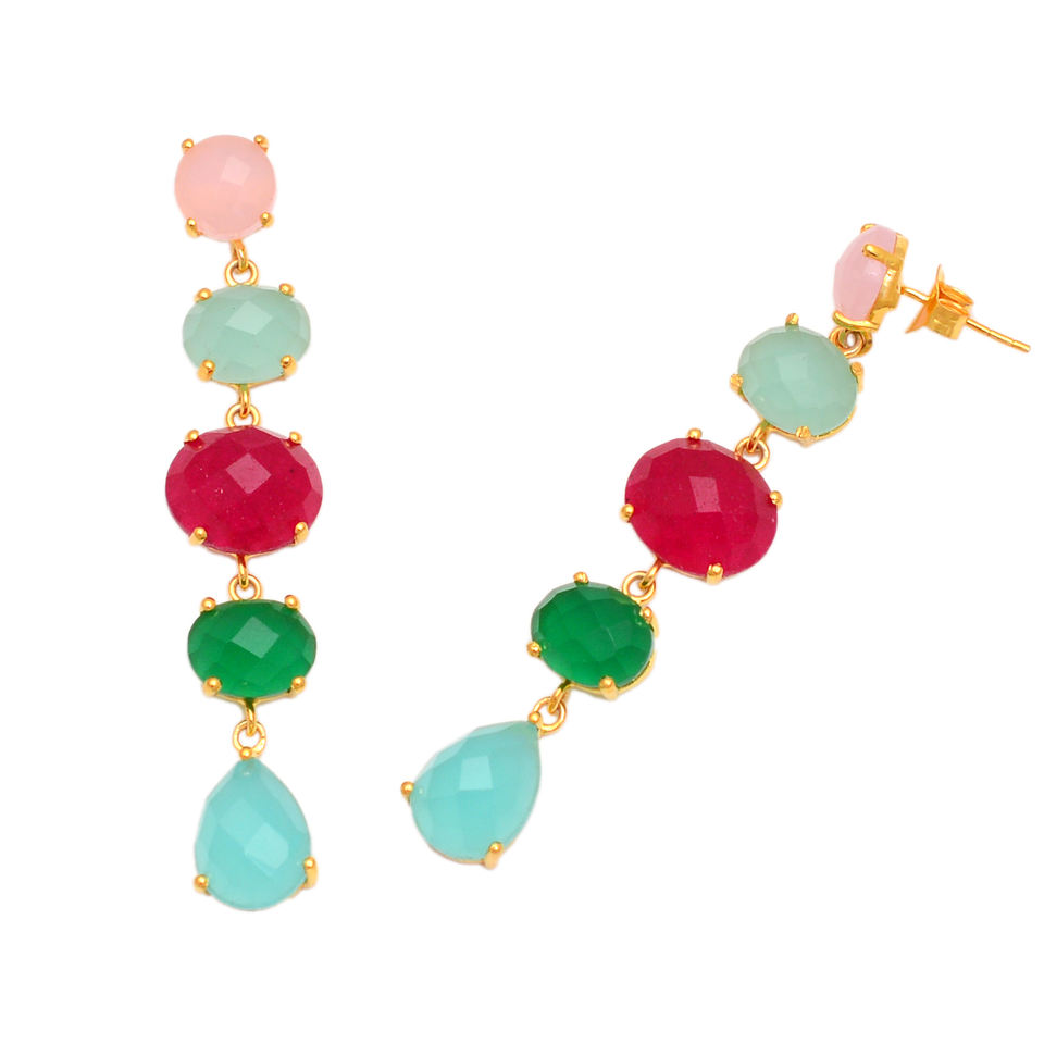 Style Unique Naturel Rubis Vert Onyx Multi Couleur Pierres Précieuses Plaqué Or Cinq Couches Cocktail 925 En Argent Sterling Goutte Femmes Boucle D'oreille