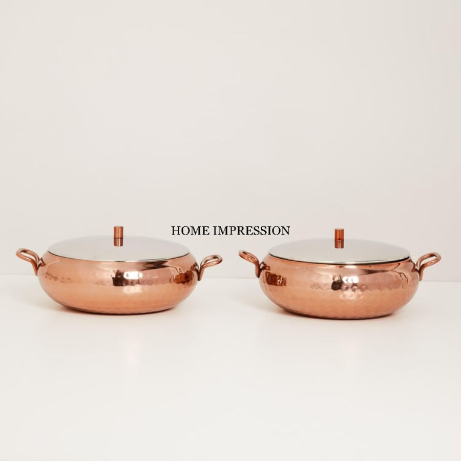 Pot chaud isolé arrondi de style unique Casseroles alimentaires décoratives en acier inoxydable en cuivre Fourniture de casseroles emballées dans une boîte