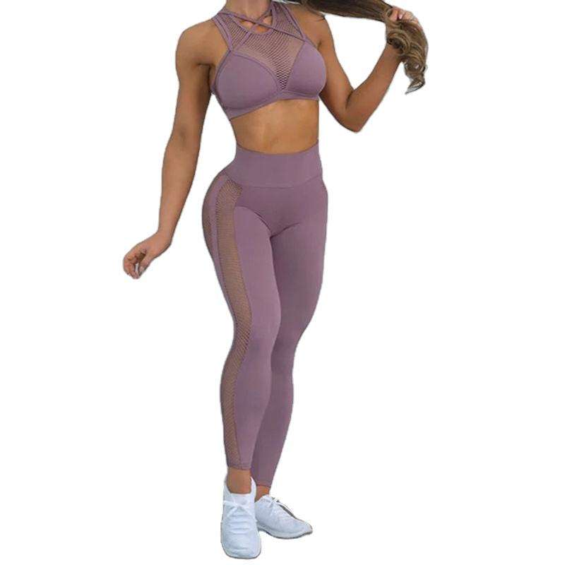 Style unique, soutien-gorge et legging en maille sexy Panneau à séchage rapide Respirant Filet élastique Tissu Patchwork Gym Fitness Ensembles pour femmes