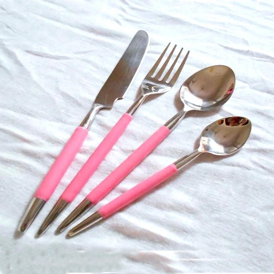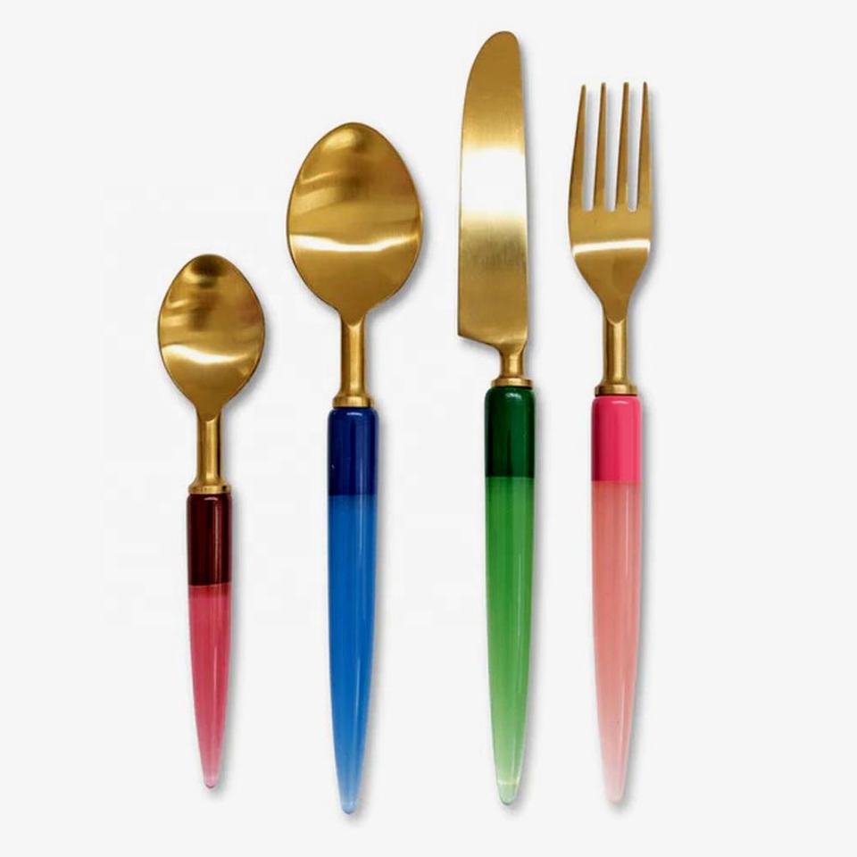 Ensemble de couverts de table en résine couleur pêche avec poignée en or poli miroir, pour table avec quatre pièces, design unique en terrazzo