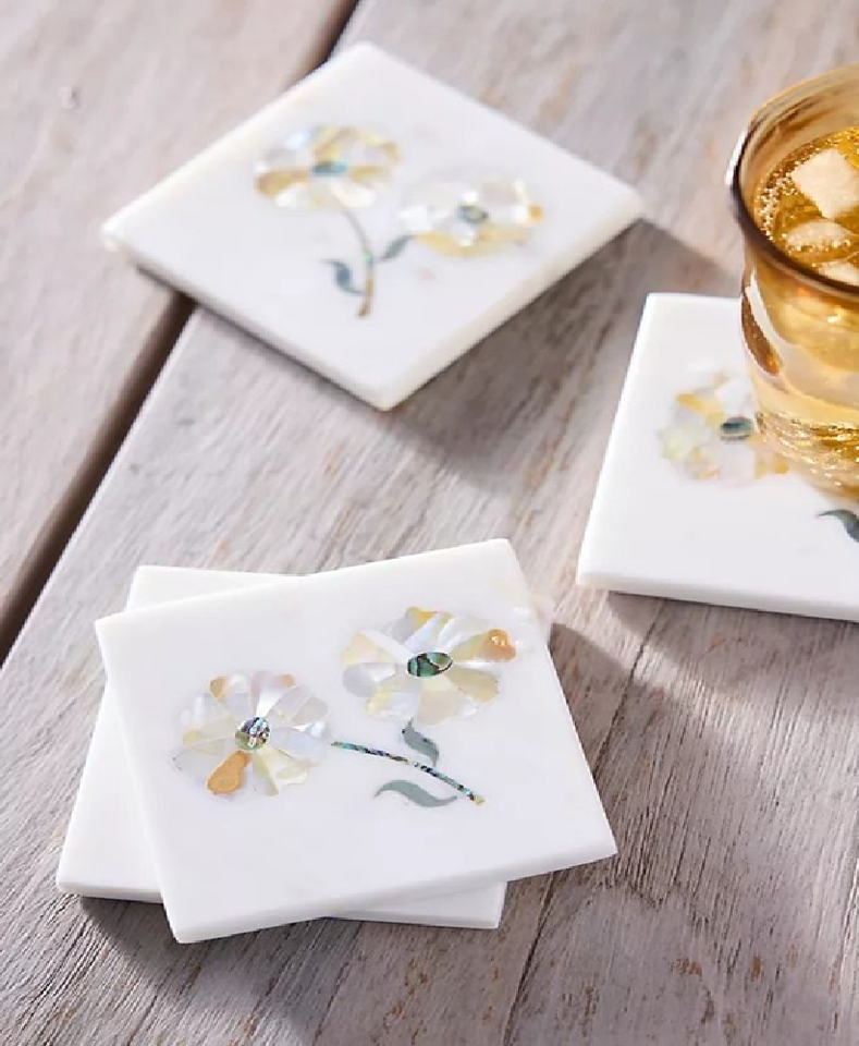 Sous-verres hexagonaux uniques en marbre blanc avec une belle incrustation en laiton de symboles de costume de carte, disponibles au prix de gros.