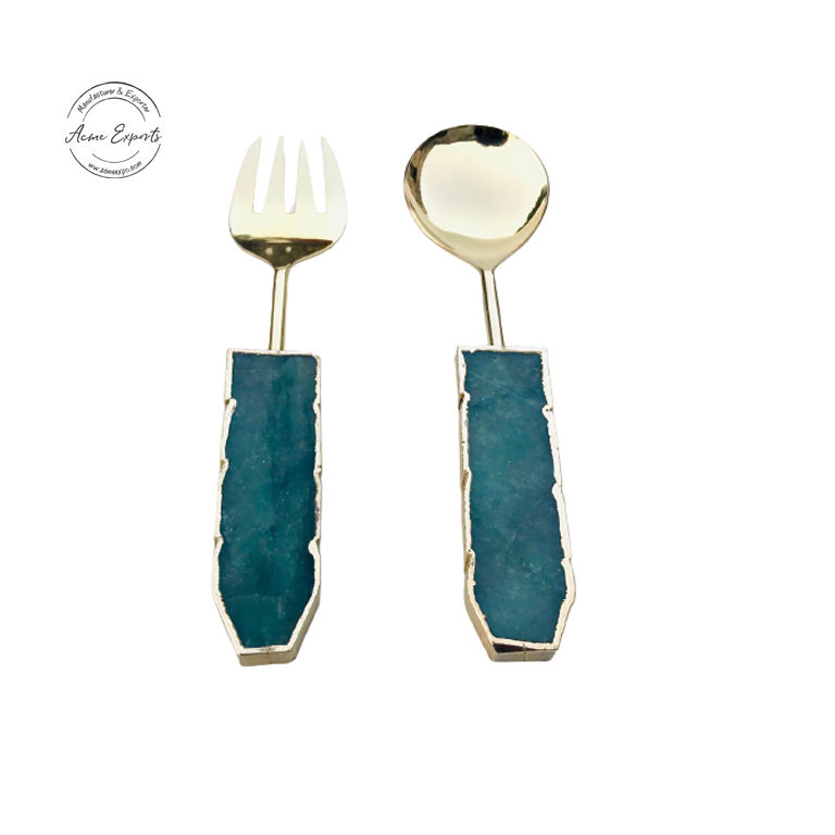 Ensemble de serveurs à salade de petite taille en laiton mat de conception unique poignées en agate verte royale outils à salade en métal