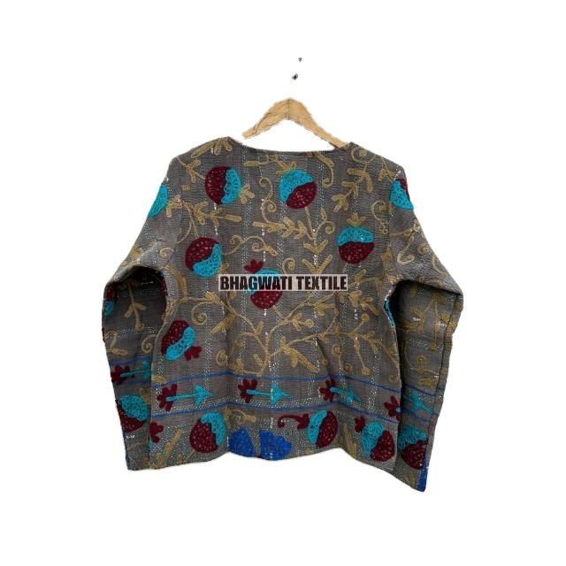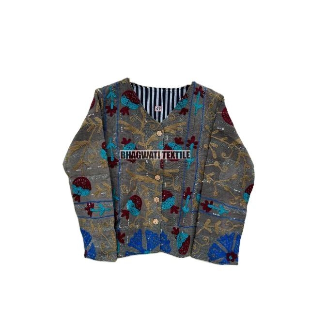 Veste Kantha unisexe à bords bruts, broderie florale à la main, coton respirant tissé Suzani pour l'automne