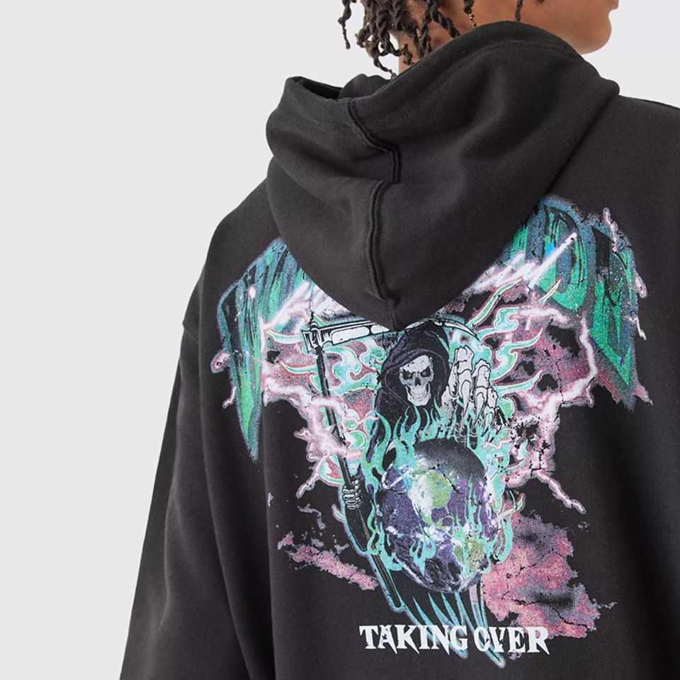Unisex Casual Pullover Oversized Fleece Hoodie Worldwide Skull Graphic Distress Embroidered Streetwear Graphic Print Winter