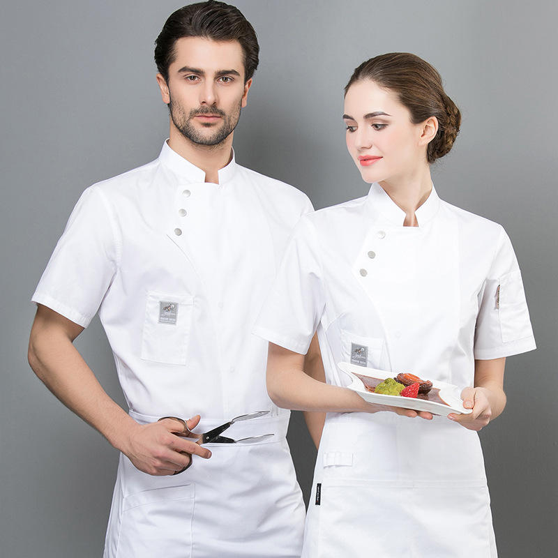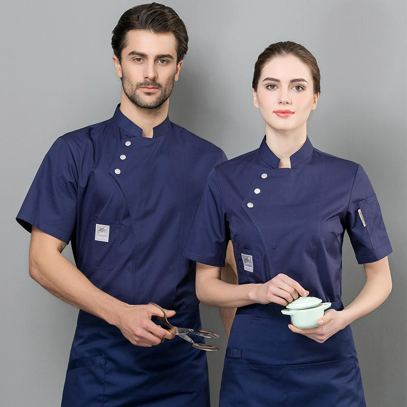 Salopette de chef unisexe à manches courtes Blouses d'été Vêtements de cuisine réguliers pour hôtel et restauration Chemises de printemps tissées pour femmes