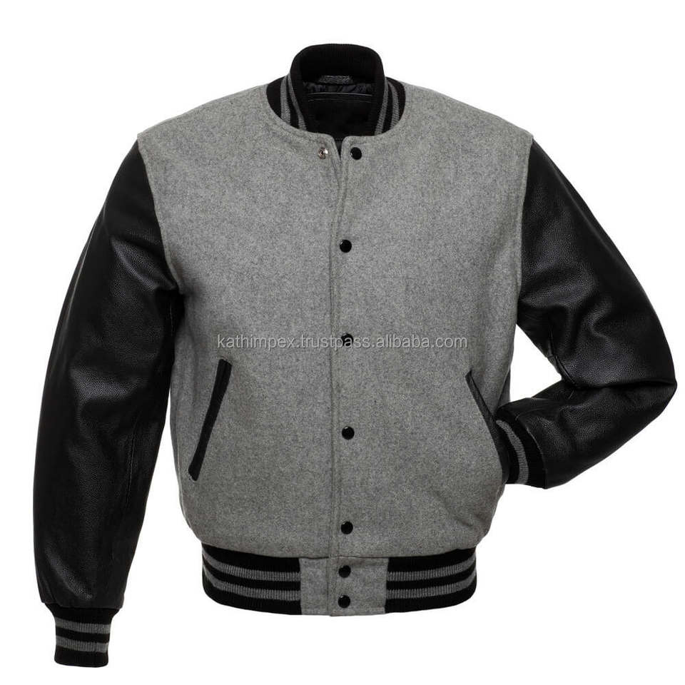 Veste en laine unisexe pour le corps, manches en cuir, broderie personnalisée, fermeture à bouton-pression, stock prêt, noir et gris pour le printemps