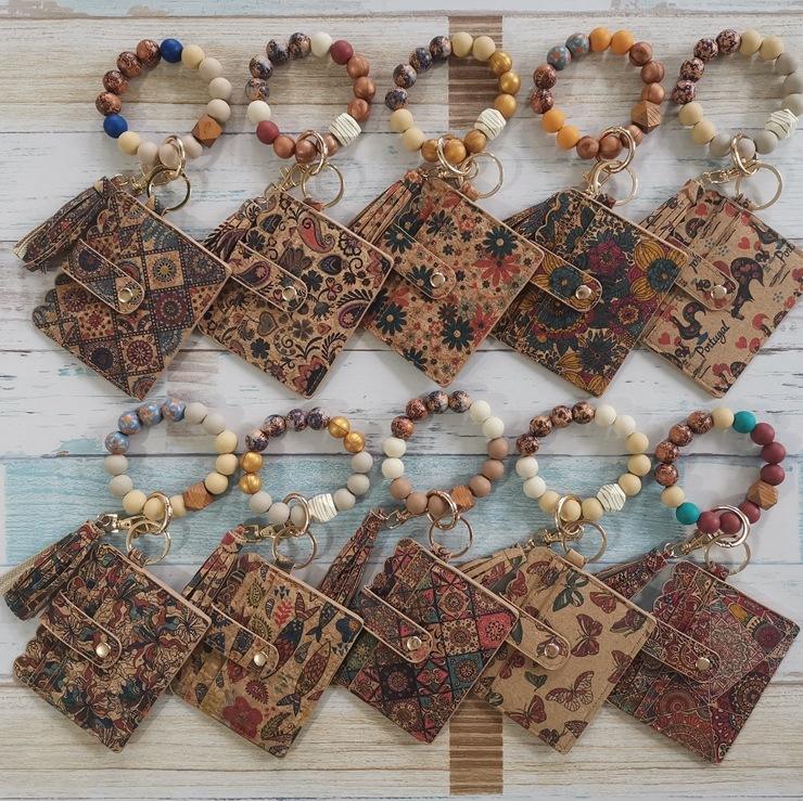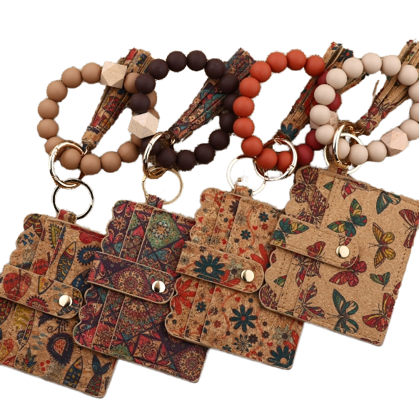 Bracelet unisexe exclusif en nylon court avec perles en silicone, porte-cartes en liège, porte-clés, fermeture à bouton portable, doublure en nylon vintage, non