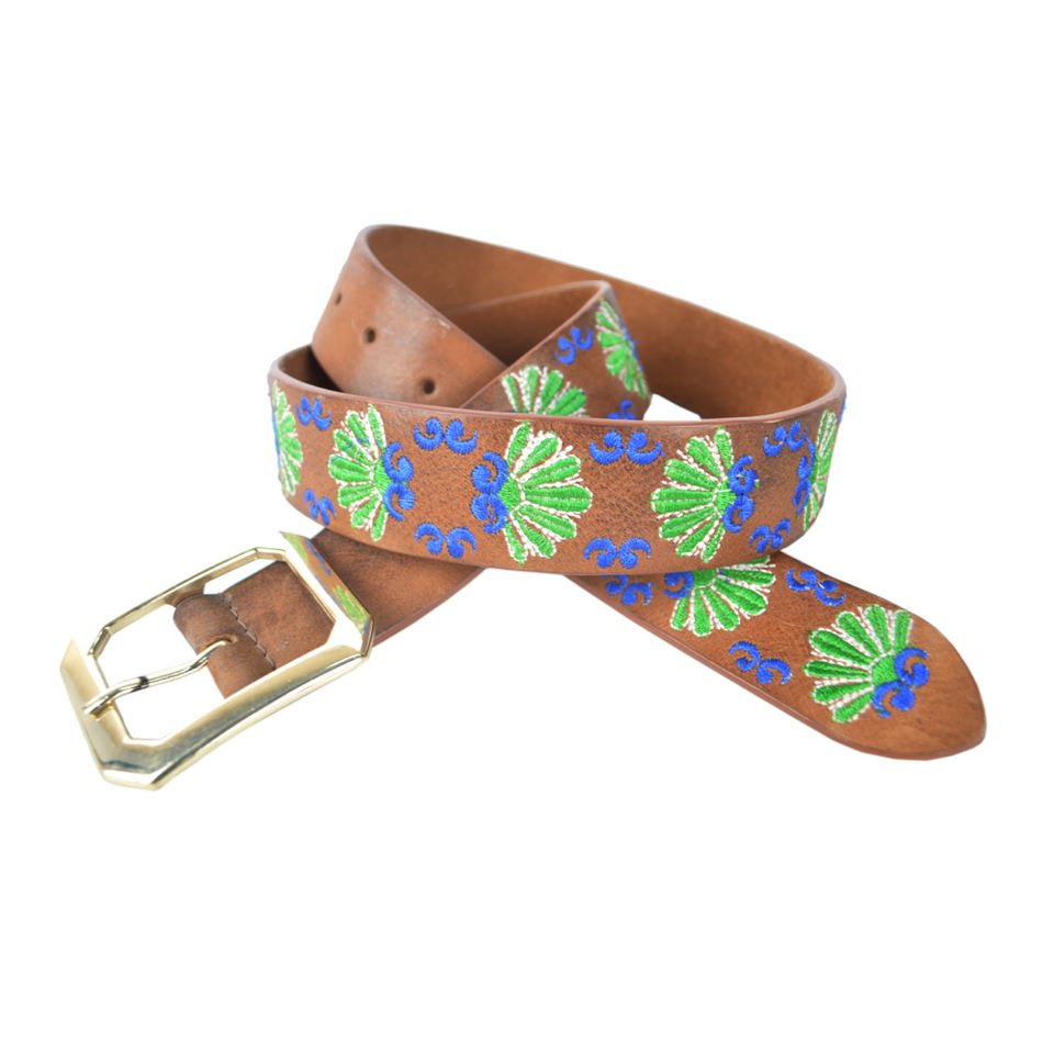 Ceinture unisexe en cuir de vachette véritable Longueur personnalisée OEB Barre centrale pour boucle Brodée à la main Broderie florale verte de créateur