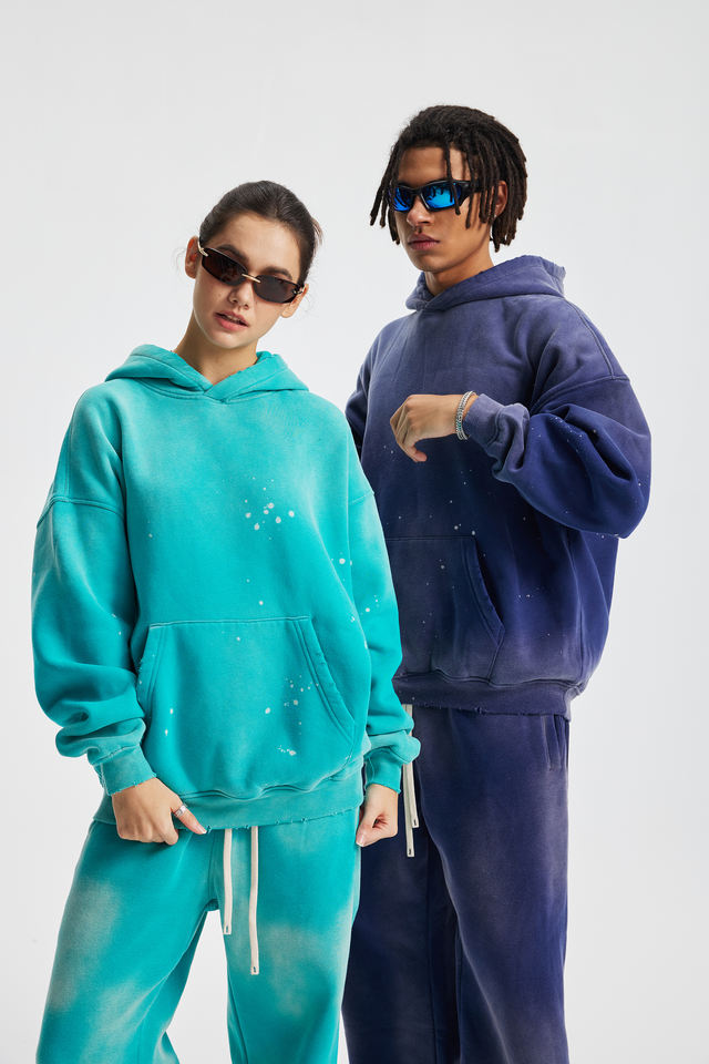 Sweat à capuche unisexe en molleton 360 g/m² de haute qualité, personnalisé, coupe oversize, effet éclaboussures d'encre, délavé, teinture pulvérisée, vintage, vieilli, à franges