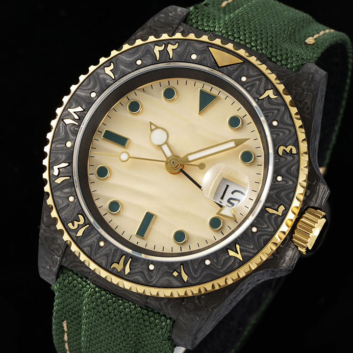 Montre unisexe de luxe avec cadran à symboles hiéroglyphiques arabes, boîtier en fibre de carbone incrusté de laiton, montre de sport en acier inoxydable