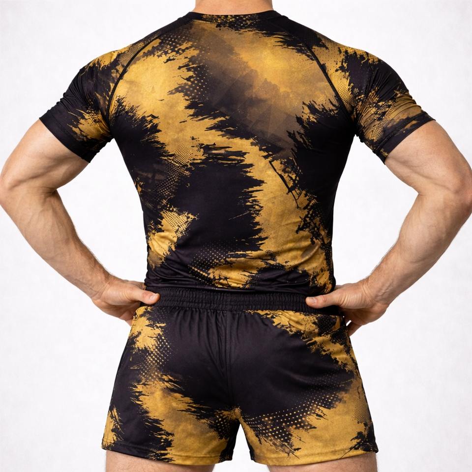 Ensemble Rash Guard de Compression Unisexe No-Gi BJJ pour Entraînement MMA – T-shirt et Short Respirants en Tissu Extensible Anti-Bactérien à Séchage Rapide Personnalisable