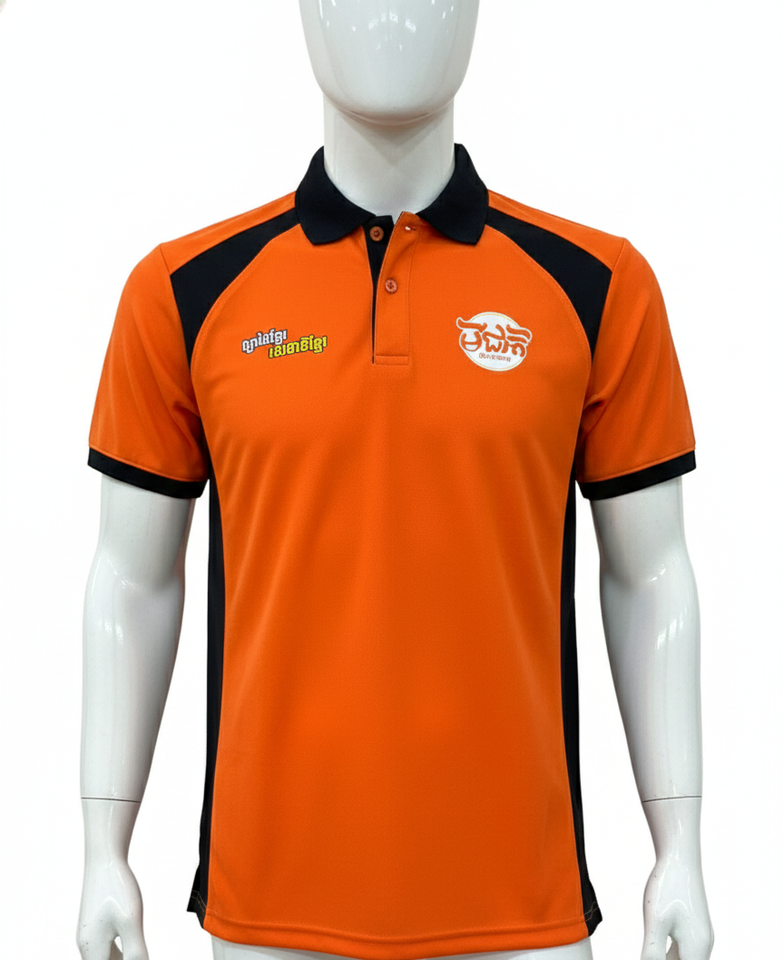 Conception:Polo orange avec des détails noirs et une patte de boutonnage à deux boutons.