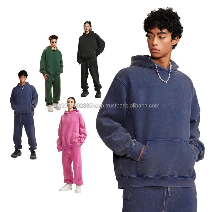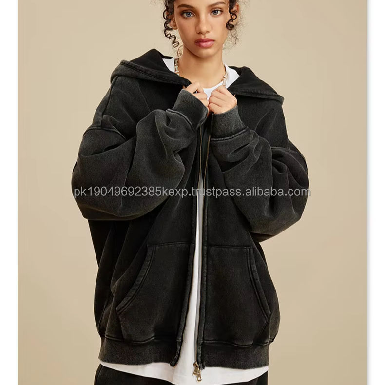 Ensemble de sweat à capuche en coton mélangé unisexe surdimensionné 355g, motif imprimé zippé personnalisé avec lavage à l'acide pour hommes, teint uni pour le printemps