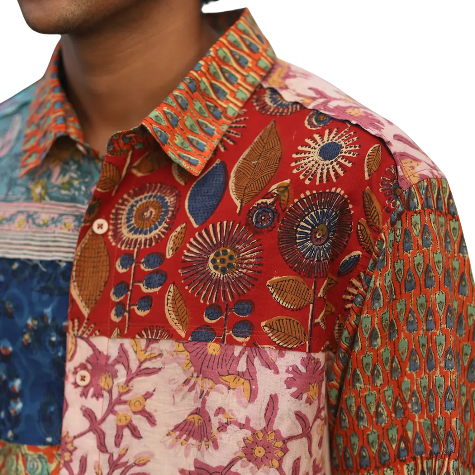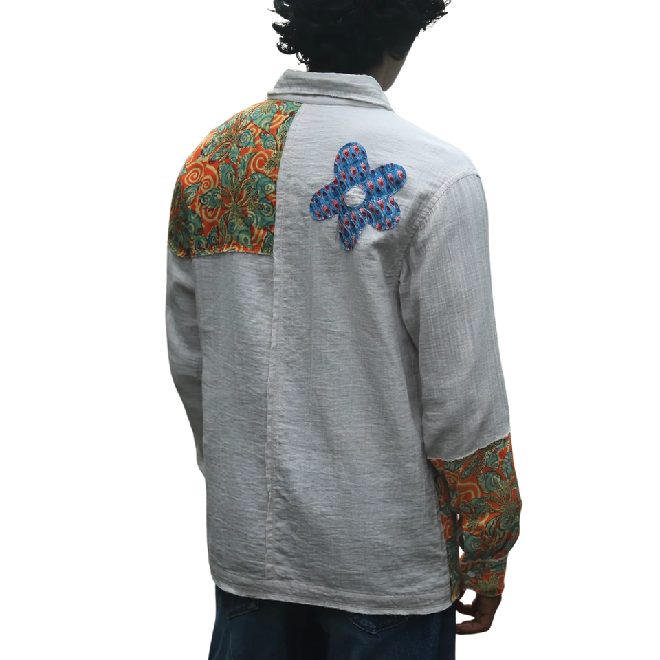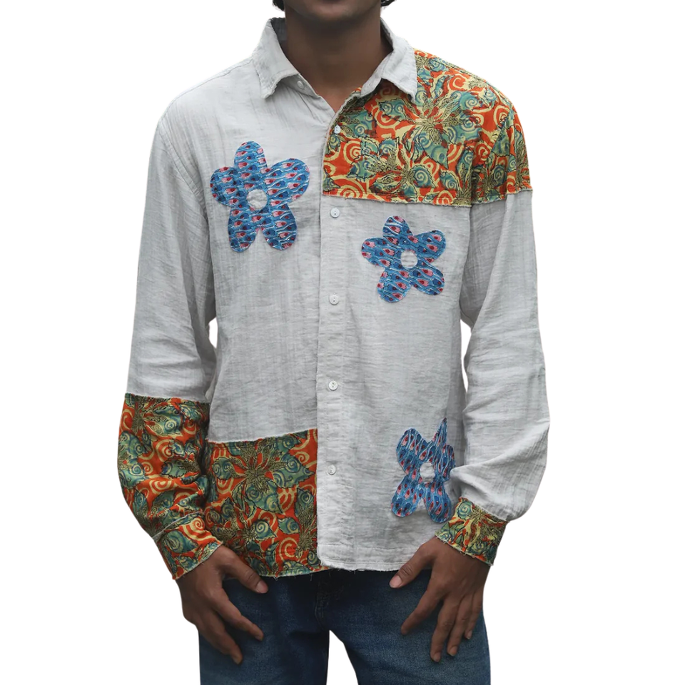 Chemise unisexe patchwork style urbain en polyester doux et respirant, décontractée à manches longues, boutonnée, style vintage, été, vente en gros OEM ODM