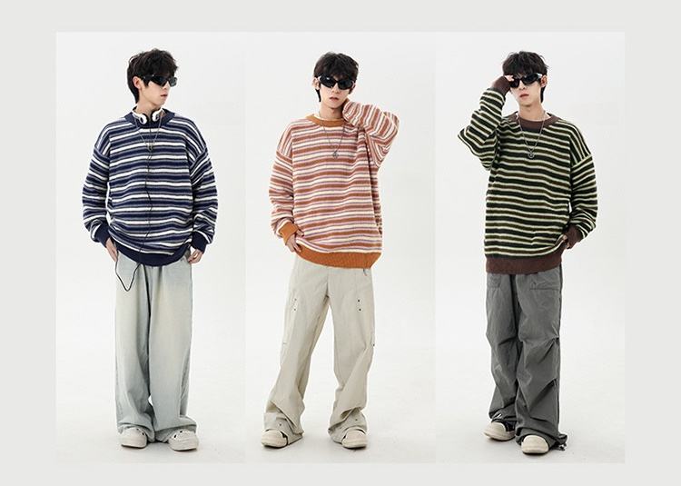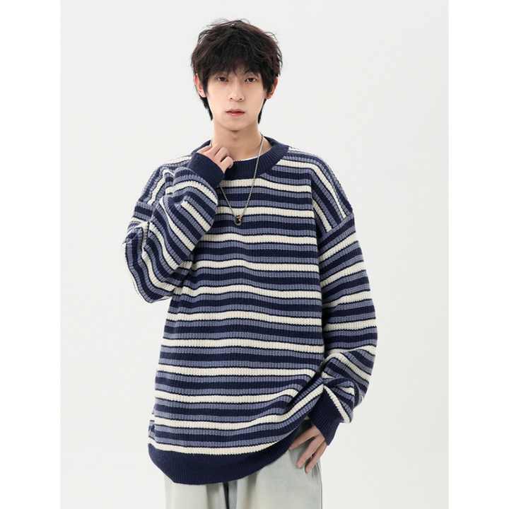 Pull unisexe rayé en maille épaisse, style rétro color block, coupe oversize décontractée, automne-hiver, avec logo frontal, idéal pour couple