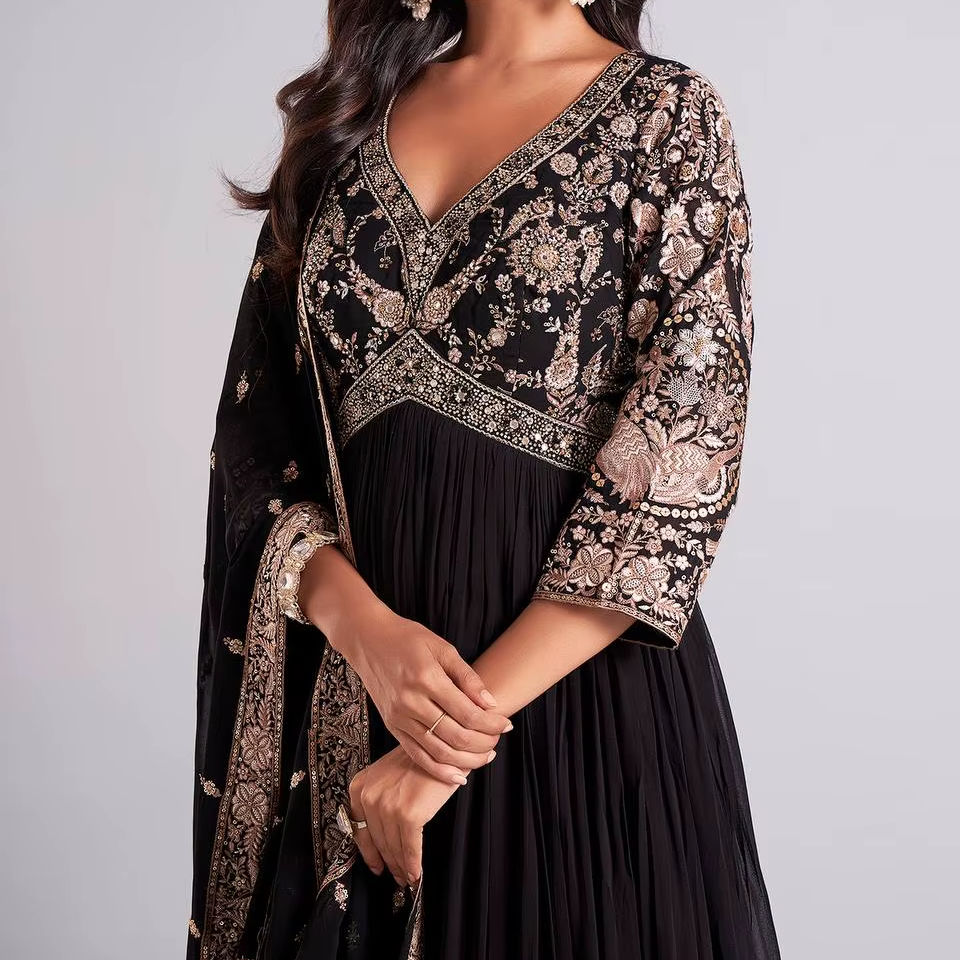 Robe Anarkali en Georgette noire brodée florale à col en V Unity Luxure avec Dupatta – Tenue de soirée festive haut de gamme respirante pour l'été