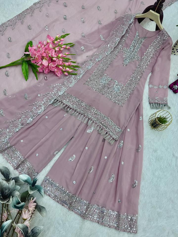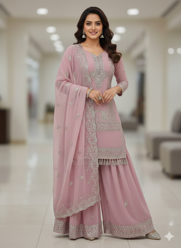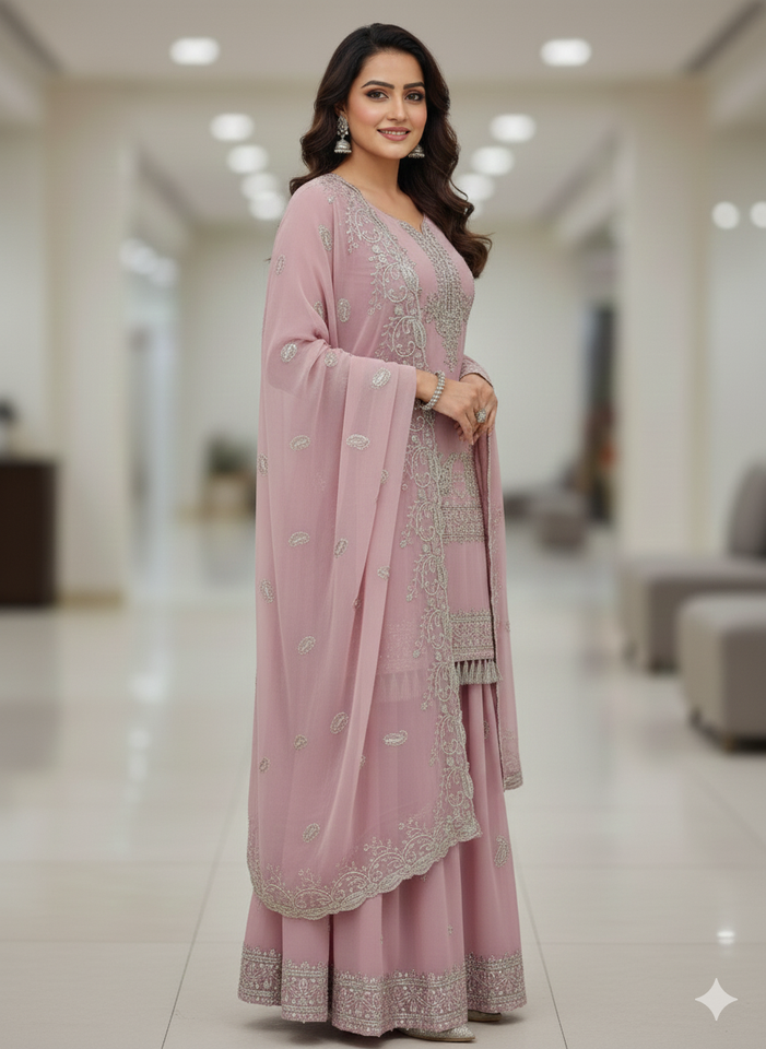 Ensemble Sharara Rose Poudré de Luxe en Georgette Brodé Respirant avec Dupatta – Tenue Festive ODM