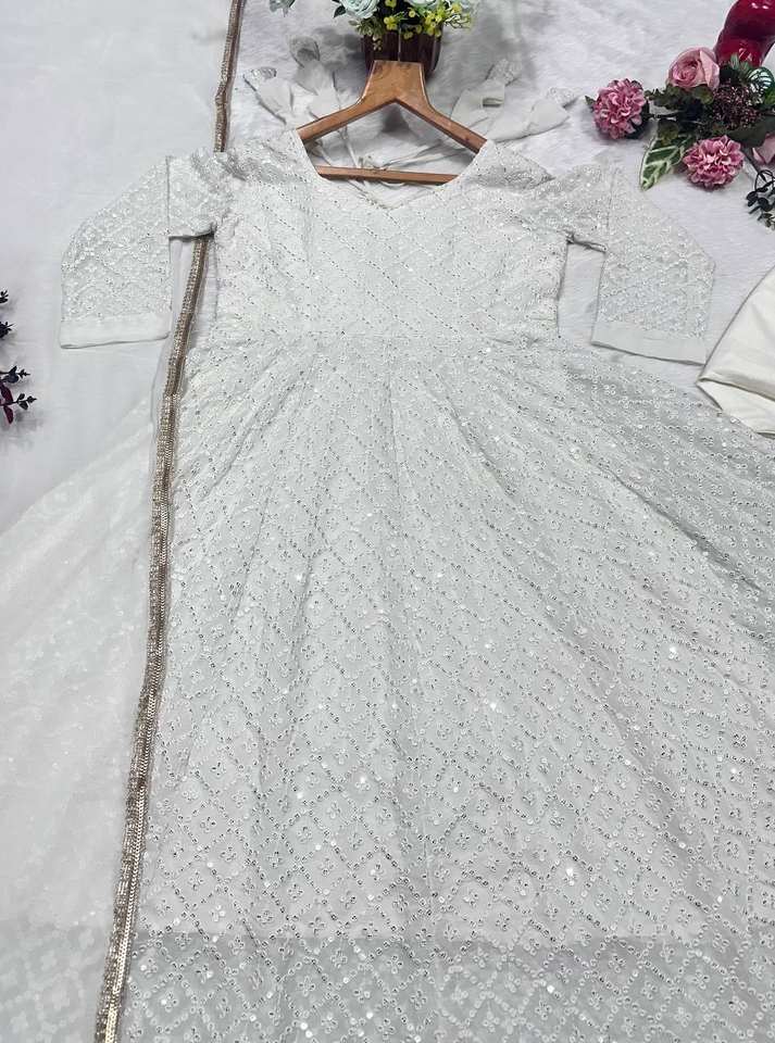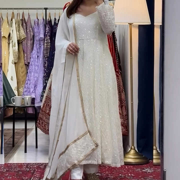 Ensemble de costume Anarkali élégant pour femme Unity Luxure, couleur ivoire, brodé, avec dupatta, haut long, longueur cheville, tissu Georgette, ODM