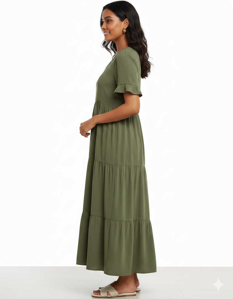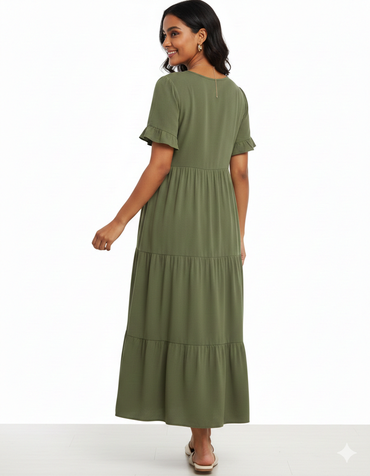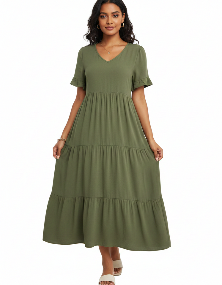 Robe midi à volants en crêpe doux de qualité supérieure pour femmes Unity Luxure avec col en V