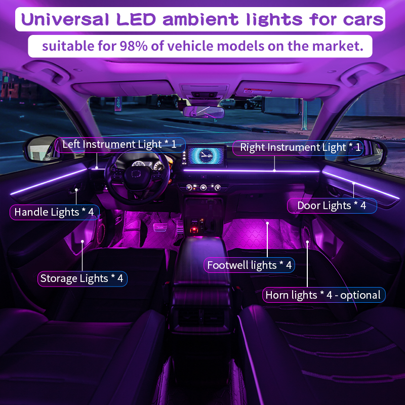 Lumière ambiante LED universelle à 64 couleurs, lampe LED à changement de couleur pour véhicules, éclairage intérieur de voiture avec changements de couleur dynamiques
