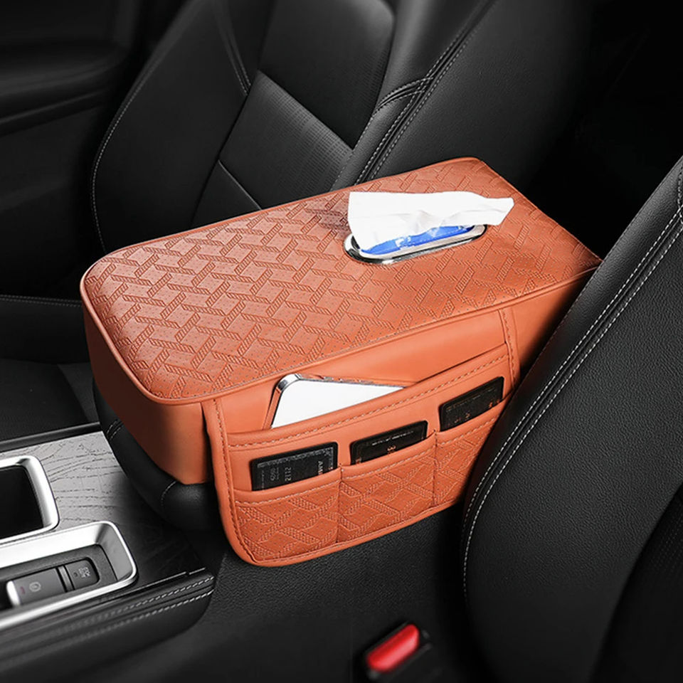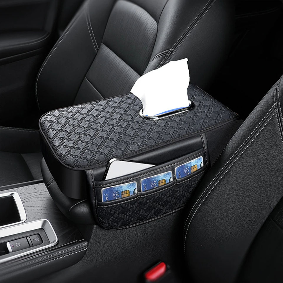 Coussin de coude de console centrale à extension universelle avec mouchoir de poche Support de téléphone en tissu Organisateur de rangement Boîte d'accoudoir de voiture