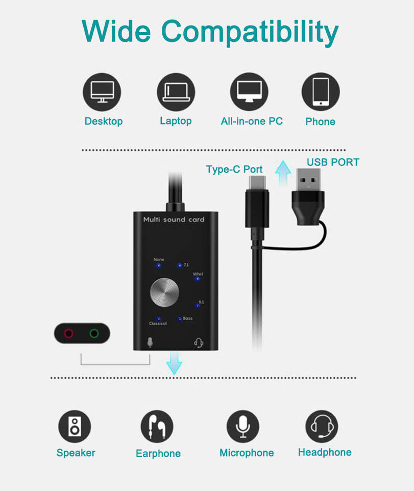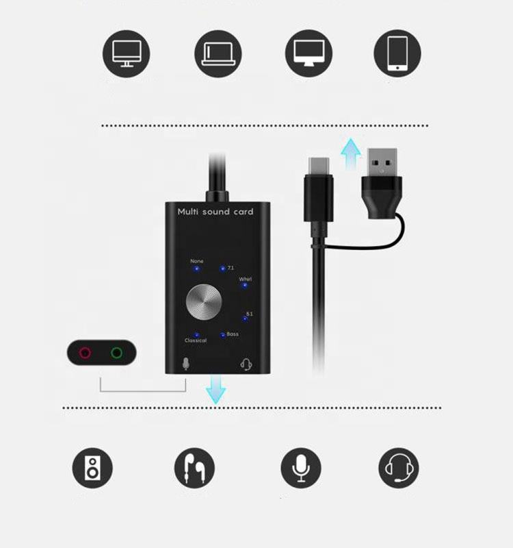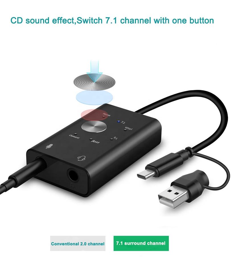 Carte son externe universelle pour jeux, adaptateur de carte son USB 7.1, virtuel 7.1, Multisound type-c 2 en 1 pour pc