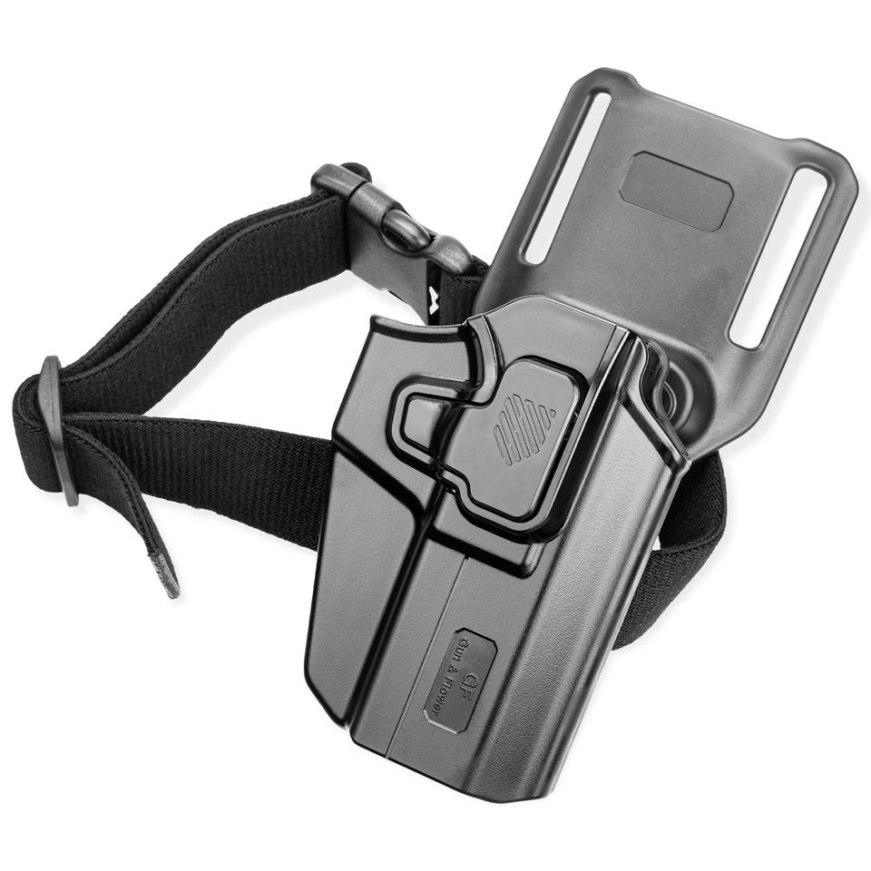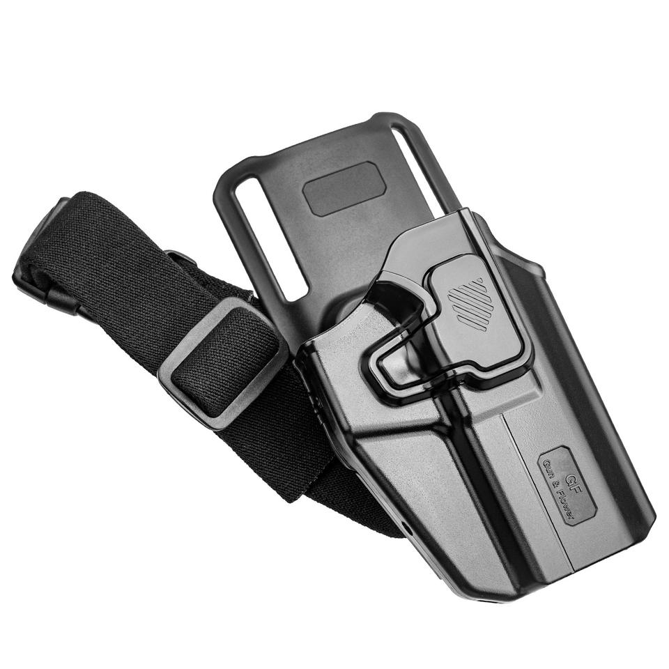 Universal Black Polymer Composite Tactical Holster with OWB Index Finger Release and Paddle Leg Strap for Outdoor Use