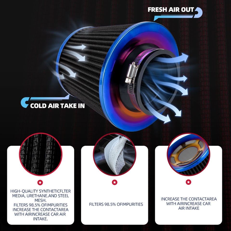 Filtres à air automobiles universels de style JDM 76 mm 3 pouces, filtre d'admission d'air, filtre à air conique à haut débit, filtre à air lavable de remplacement
