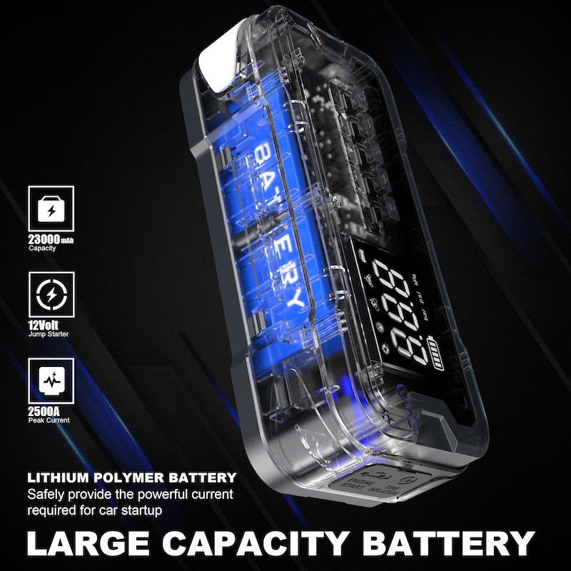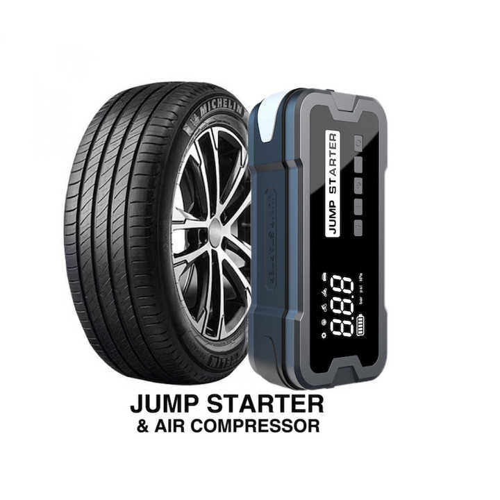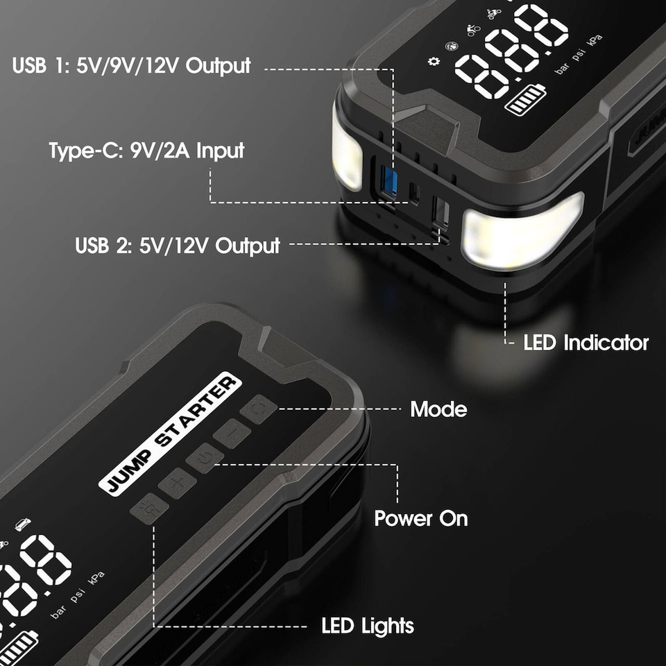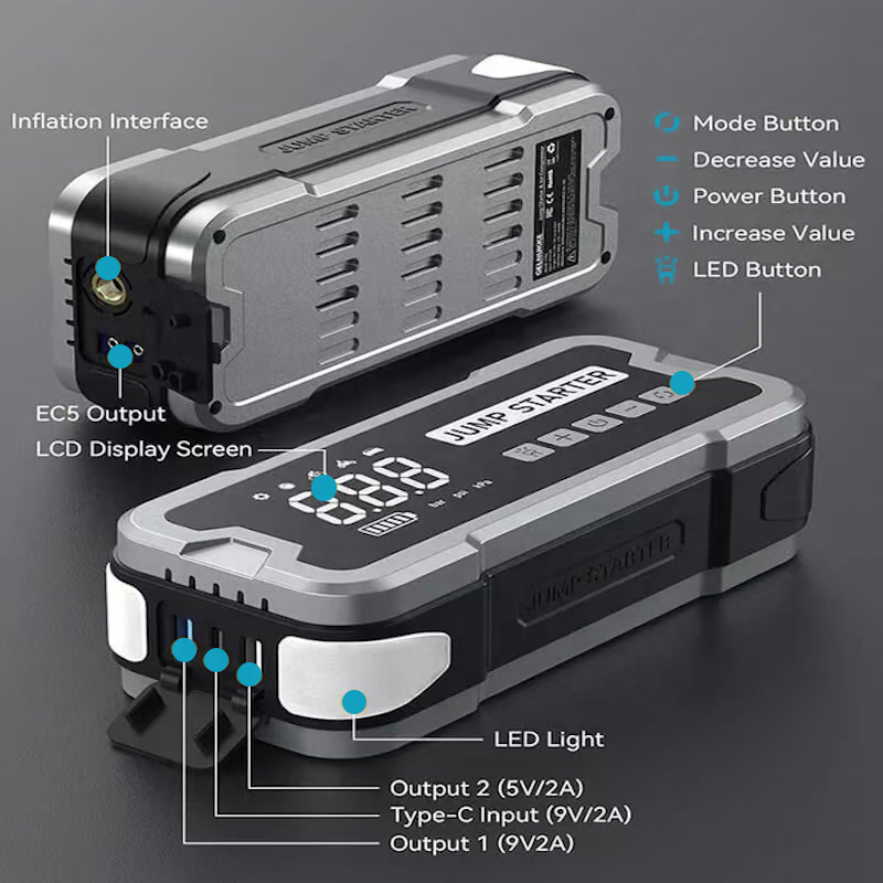 Éclairage LED, Anti-étincelles, Écran numérique, Batterie externe, Gonfleur de pneus, Pompe à air, Compresseur d'air