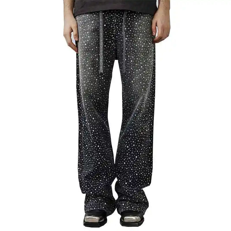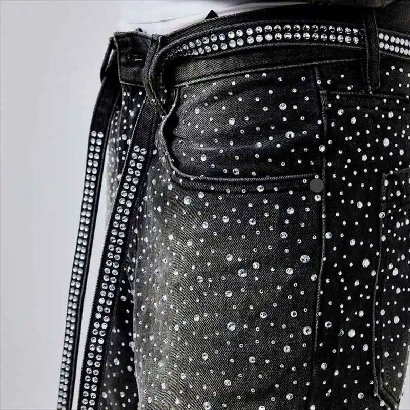 Libérez votre diva intérieur avec nos jeans glamour taille haute ornés de cristaux fins sur ce pantalon en denim à strass.