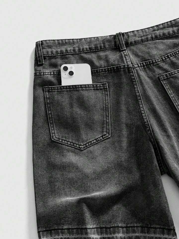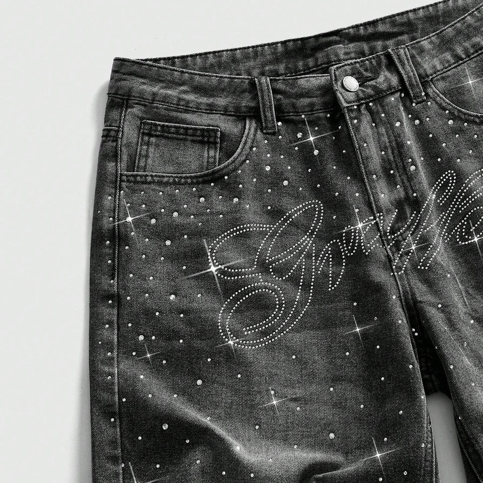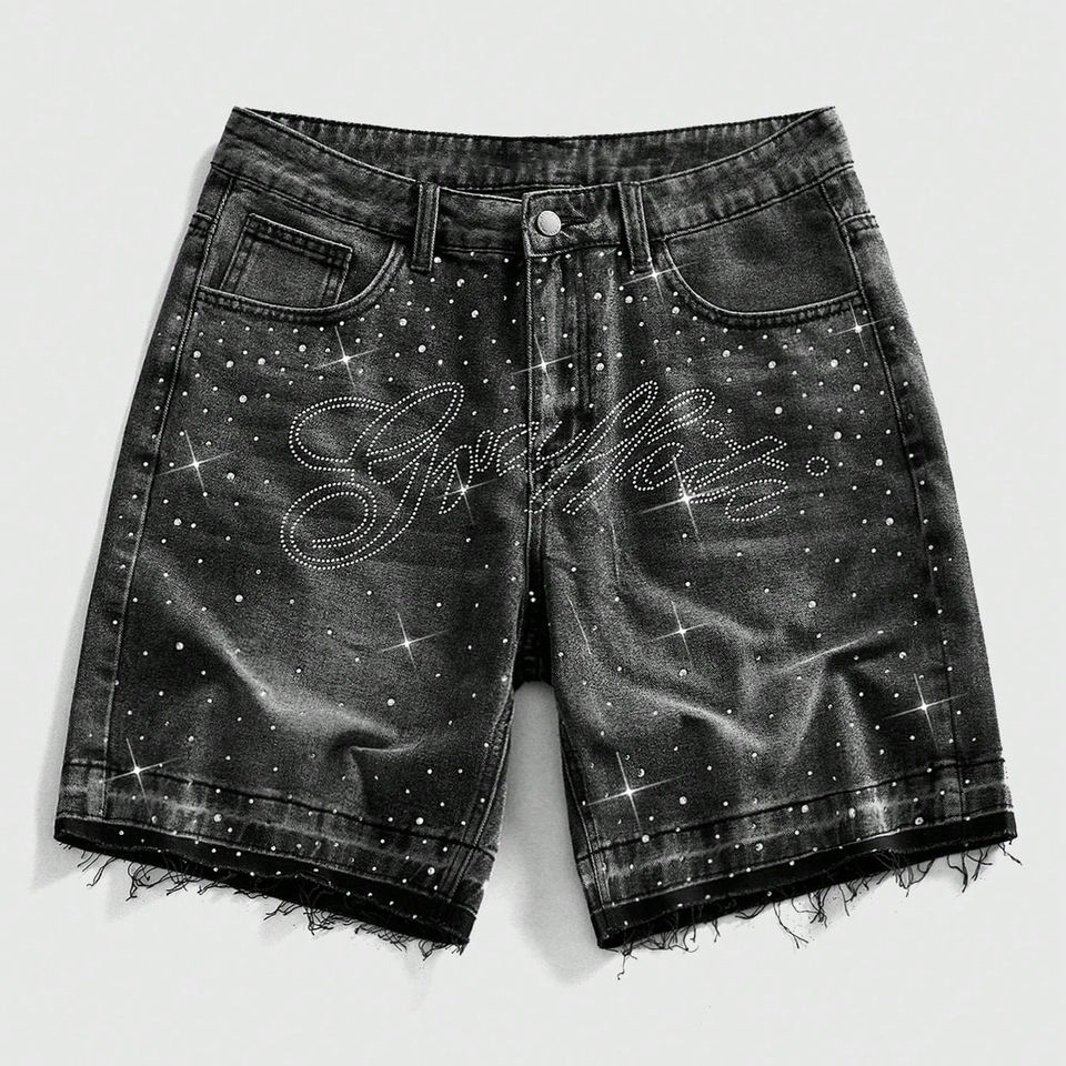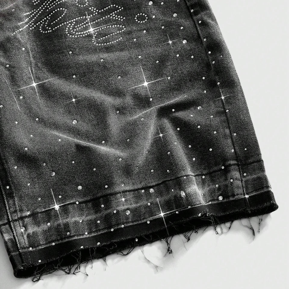 Shorts en jean décontractés pour hommes, personnalisés avec lettres graphiques et strass, en tissu 100% denim, pour la vente en gros