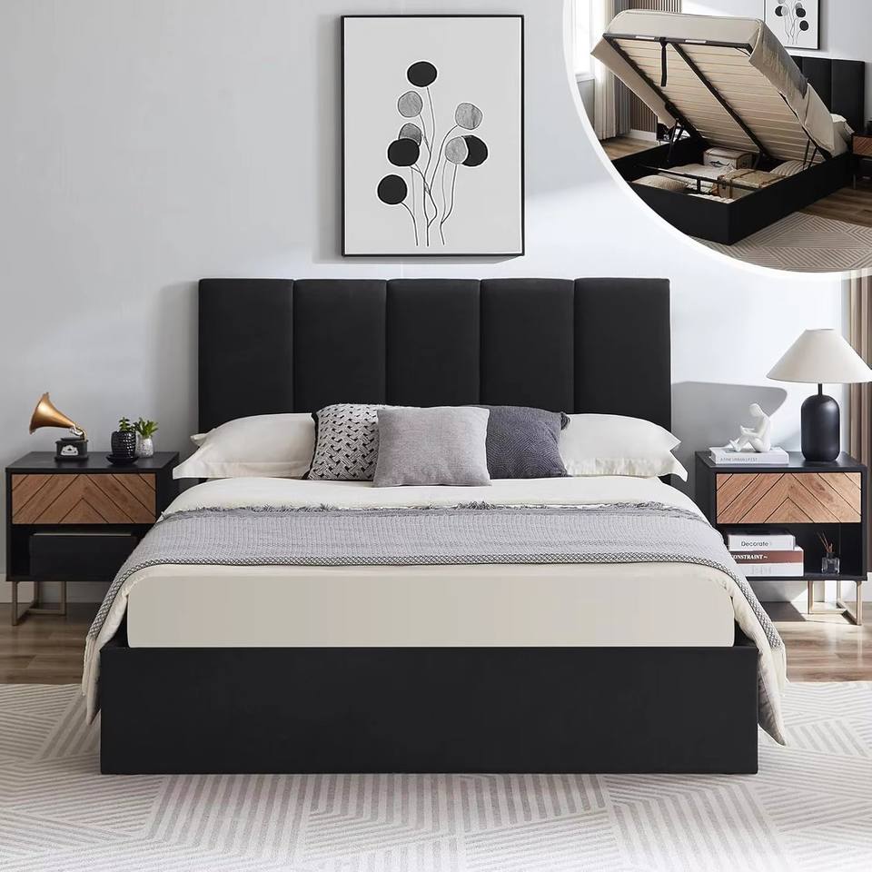Cadre de lit rembourré avec barre de levage, grand espace de rangement, 160 x 200 cm, cadre de lit en velours, support en lattes de bois