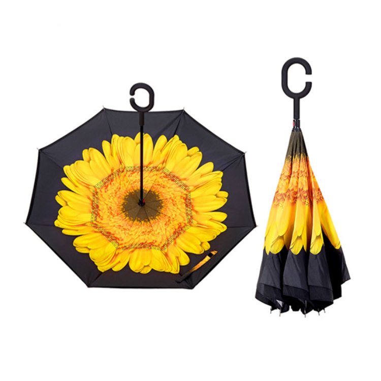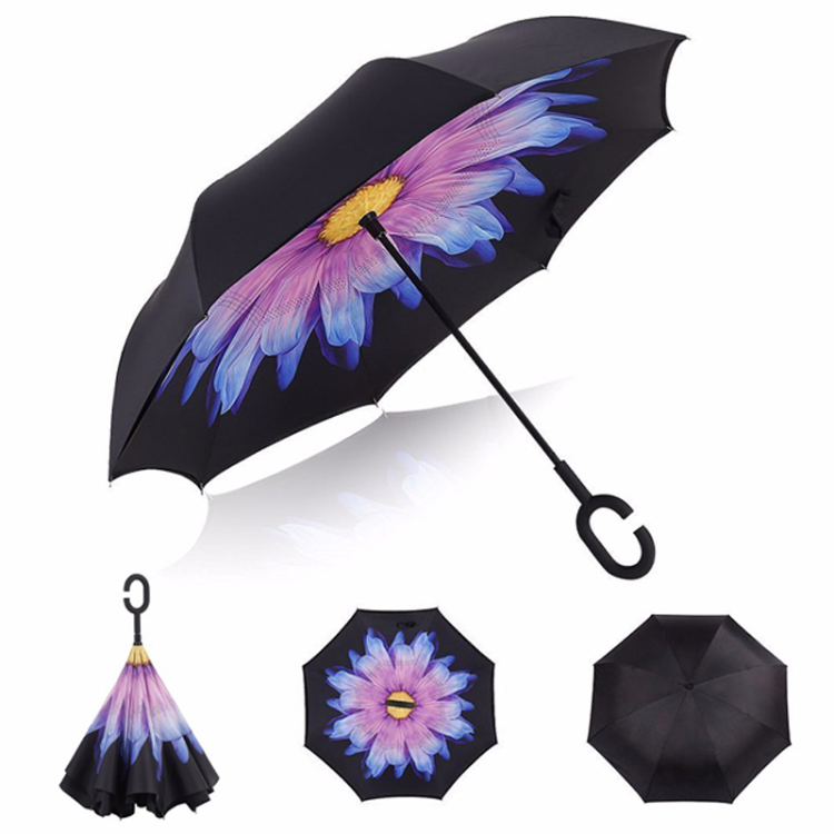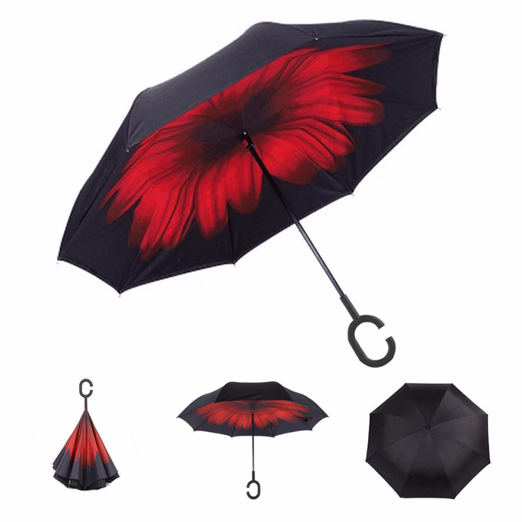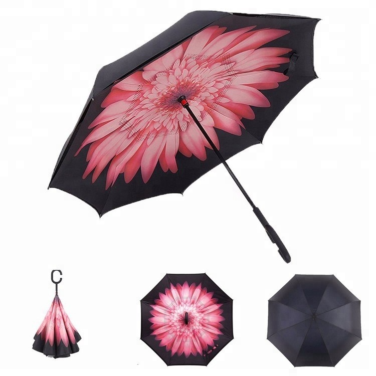 Parapluie manuel inversé mains libres, design innovant suspendu à l'envers, impression rose