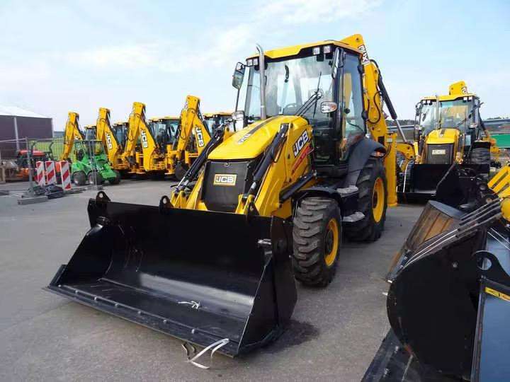 Chargeuse-pelleteuse JCB 3CX d'occasion avec moteur Perkins et godets avant de 1,0 m³ et arrière de 0,3 m³ pour travaux de construction