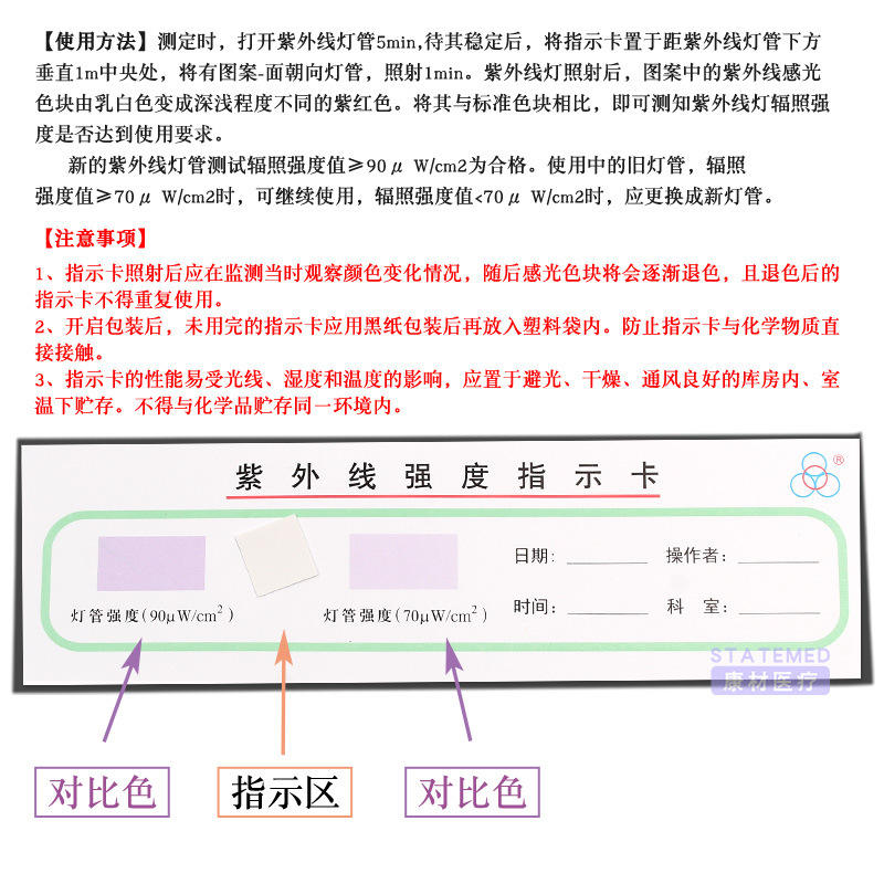 Carte indicatrice d'intensité UV 90W/cm pour la détection des tubes de lampe avec fonction de comparaison des couleurs