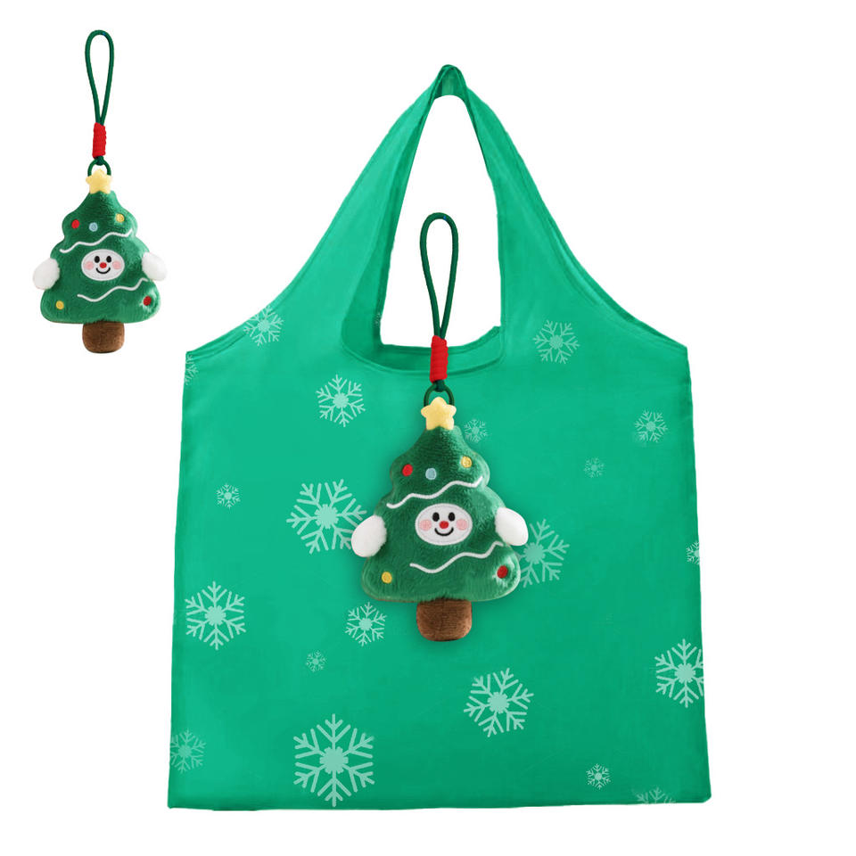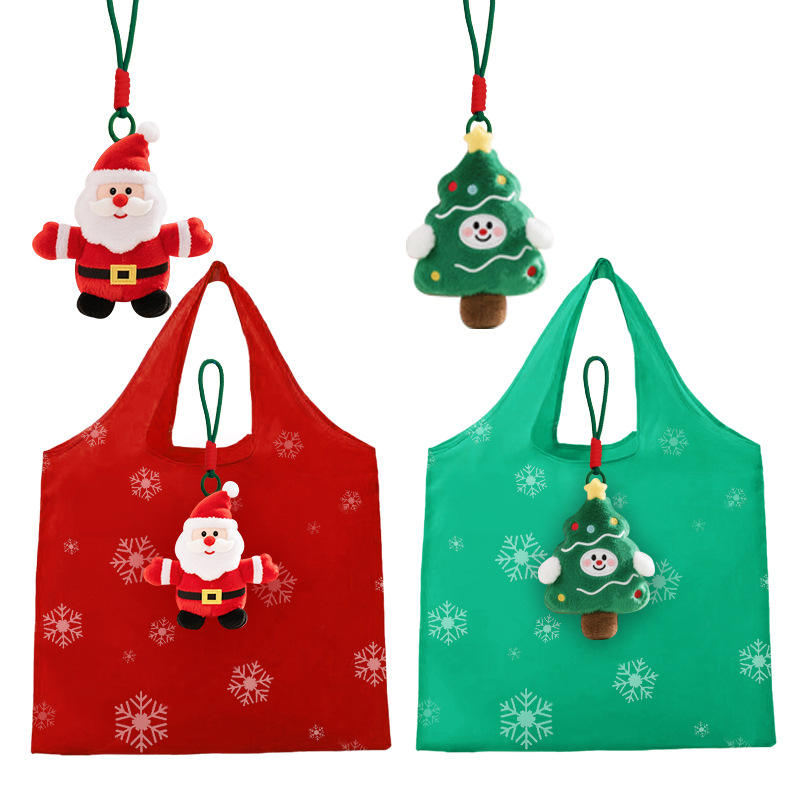 Sac de courses pliable en peluche courte, motif de dessin animé de Noël avec un arbre vert et un Père Noël mignon, jouet en peluche de Noël personnalisé, sac à main