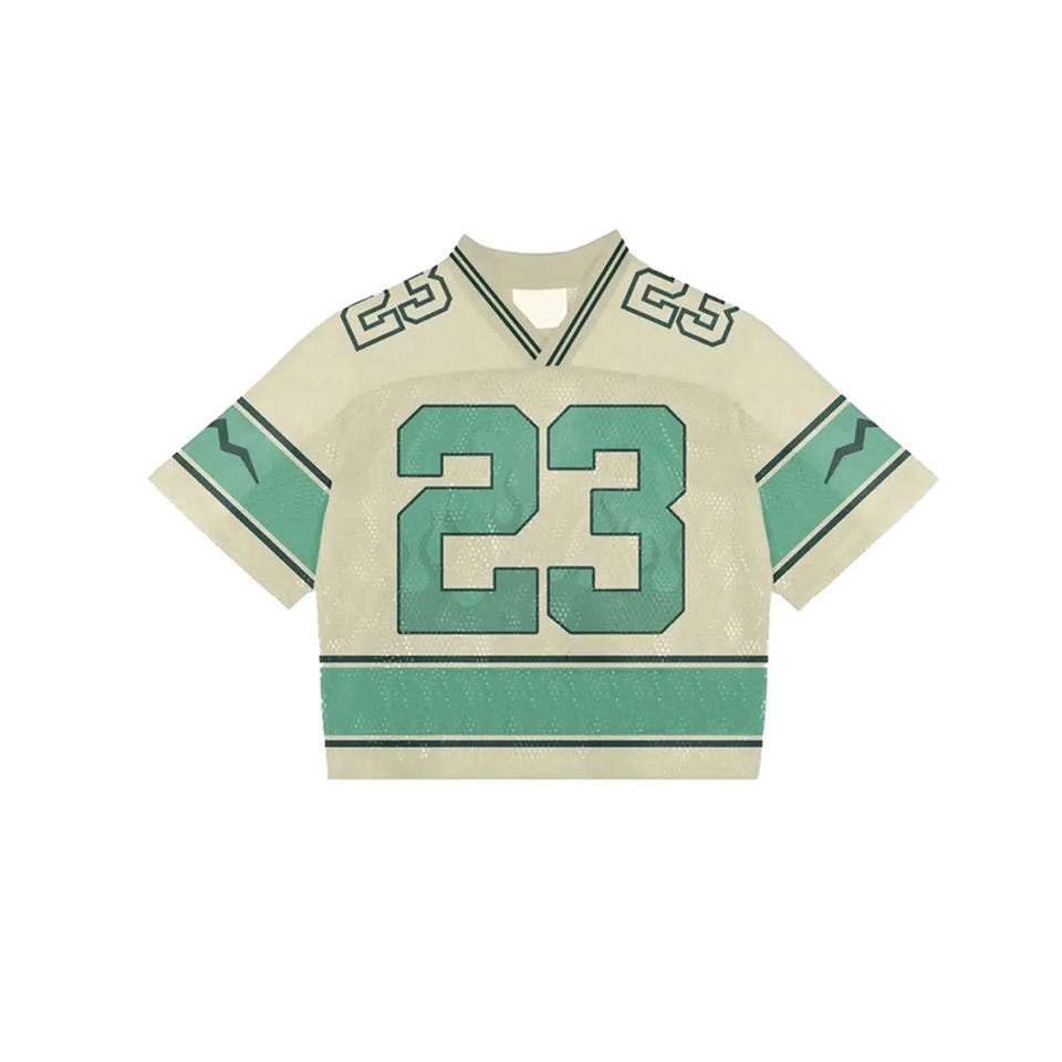 Maillot de rugby en tissu mesh à col en V, service OEM, logo personnalisé imprimé par transfert thermique, vêtements de sport courts personnalisés, style américain