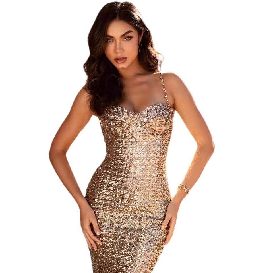 Col en V mi-longueur sans bretelles Sexy Slim Fit robe pour Amazon transfrontalière commerce européen américain Style européen en mousseline de soie à paillettes