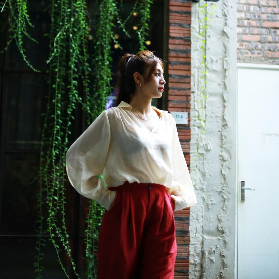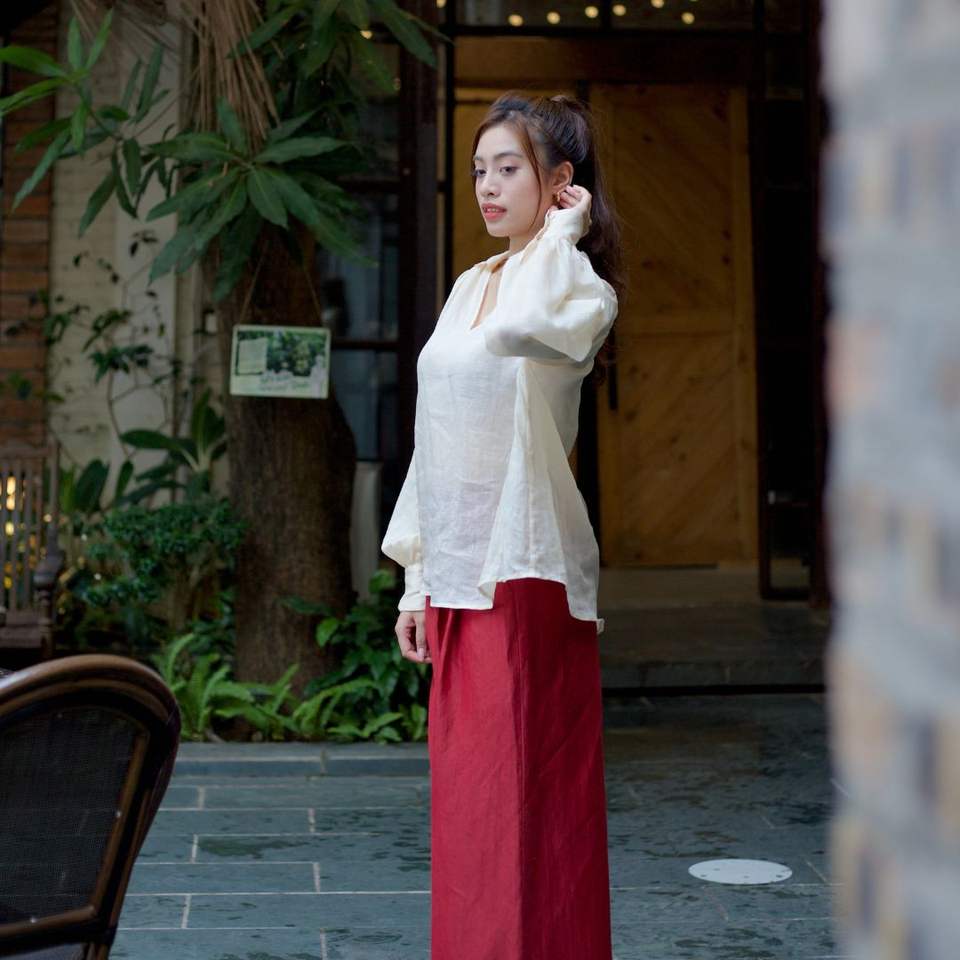 V-Neck Women's Elegant Blouses Sway Print Pattern Logo Decoration 15% Linen 85% Rayon Full Sleeves Formal Loose Fit XS Size