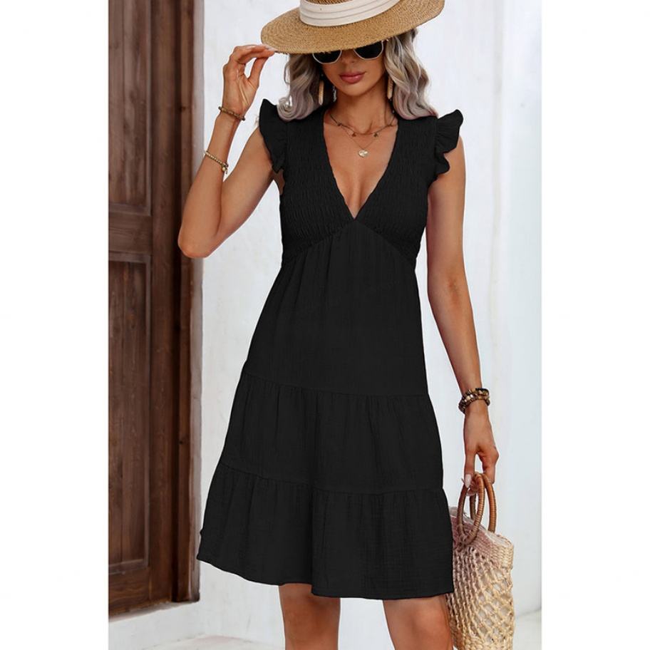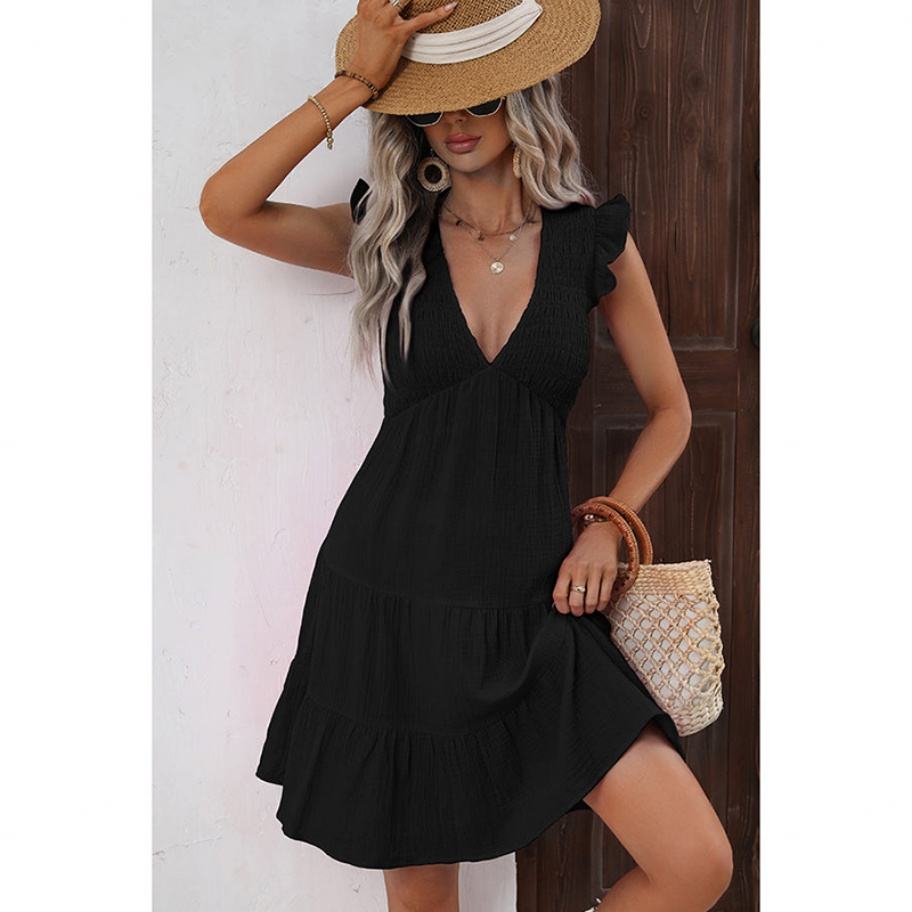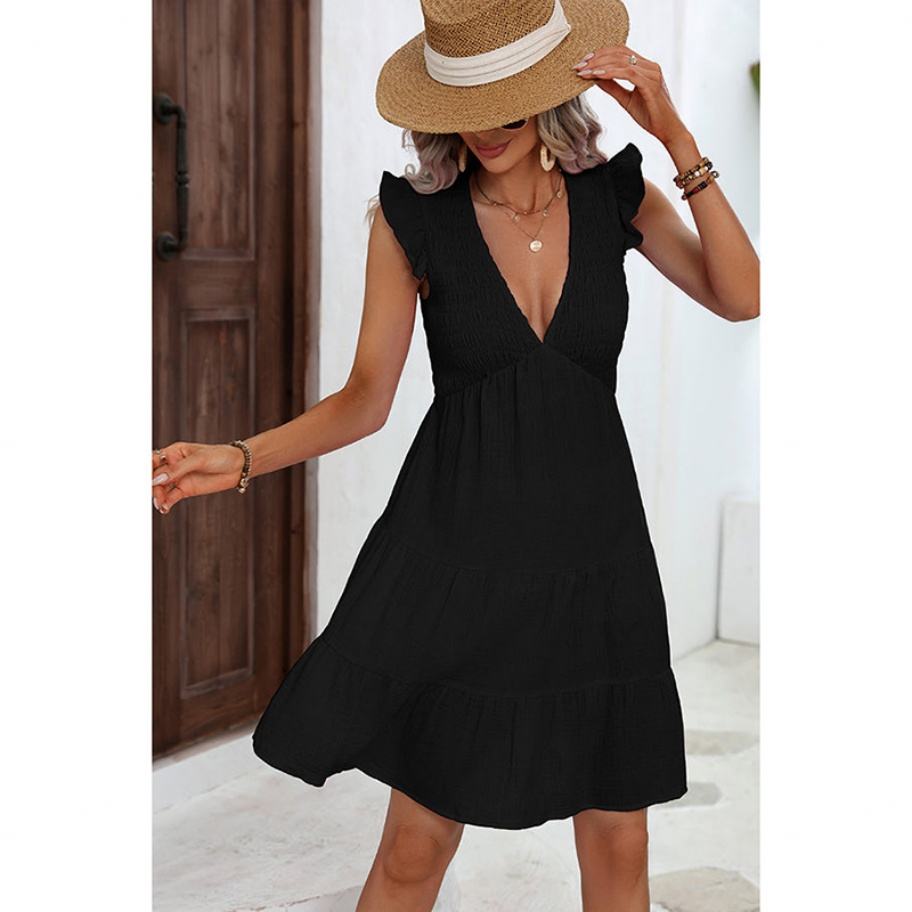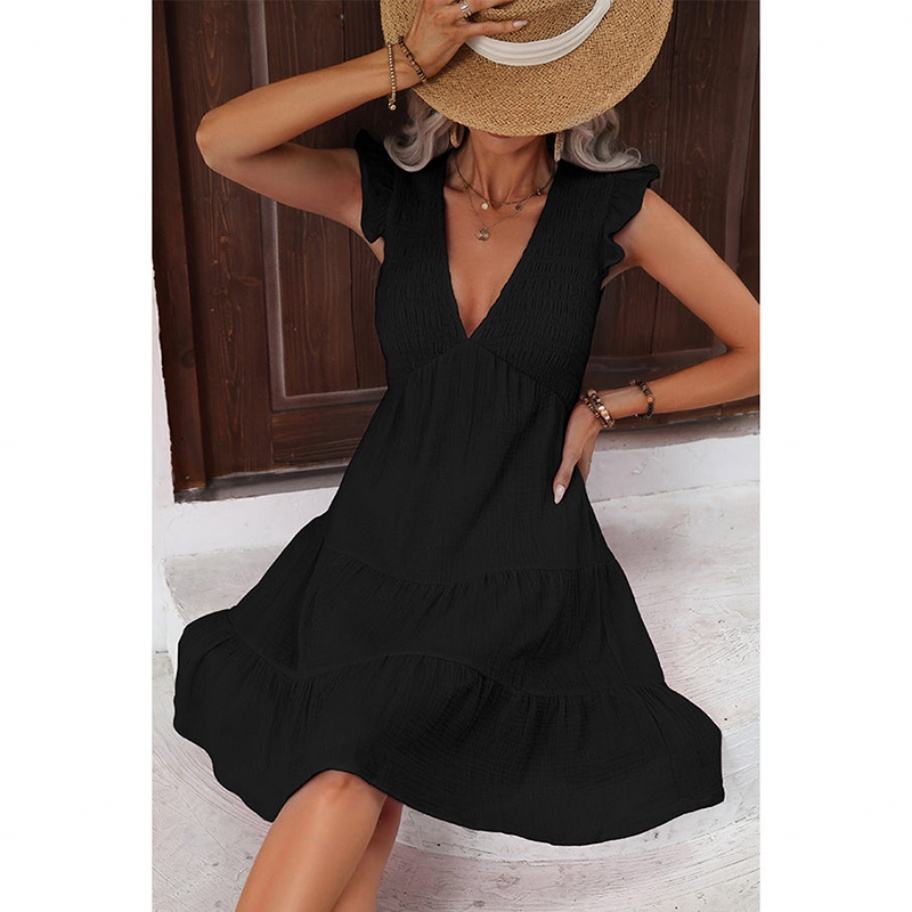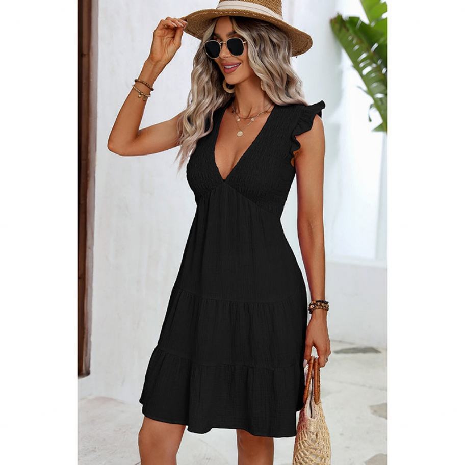 Robe mini de plage sans manches à col en V, motif floral, tissée, écologique, unie, plissée, à ourlet volanté