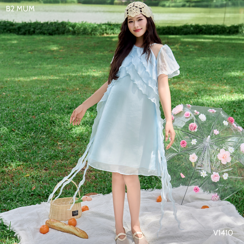 V1410 Robe en soie bleue à volants pour femmes enceintes, tissu en soie perlé absorbant la sueur, fermeture à glissière arrière à 2 couches, été