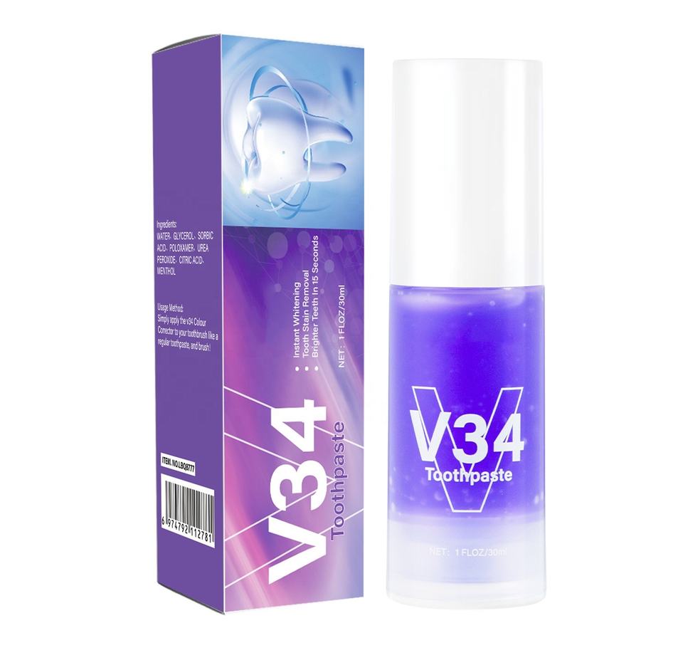 Dentifrice V34 violet pour correction de la couleur des dents, élimination des taches de fumée, blanchiment des dents