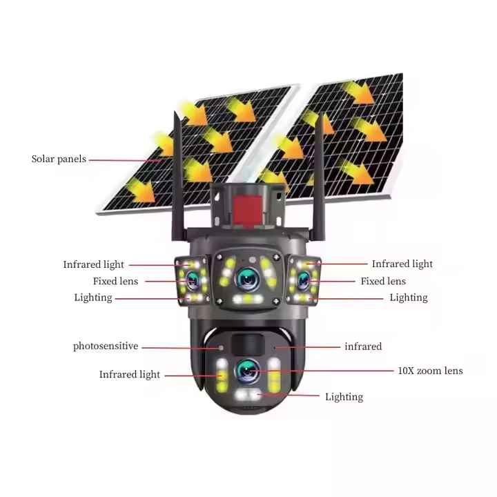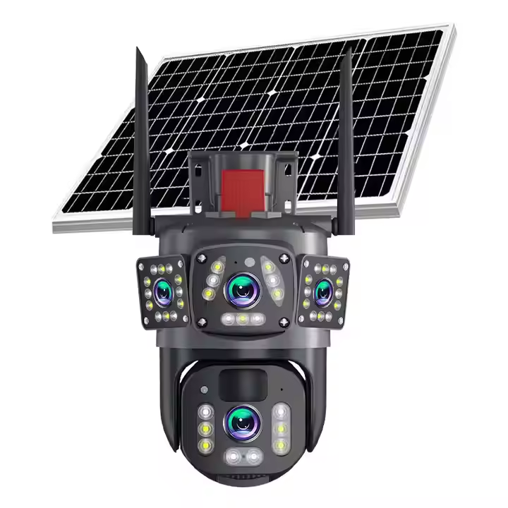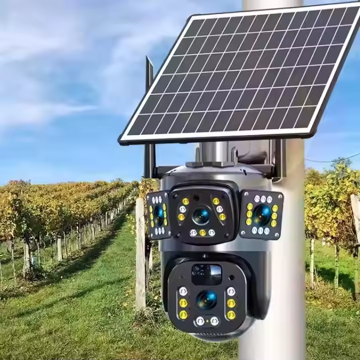 Caméra de surveillance IP sans fil V360 4G avec carte SIM, solaire, extérieure, 4 objectifs, 3 écrans, WiFi, 12MP, 4K, IA, CCTV, PTZ