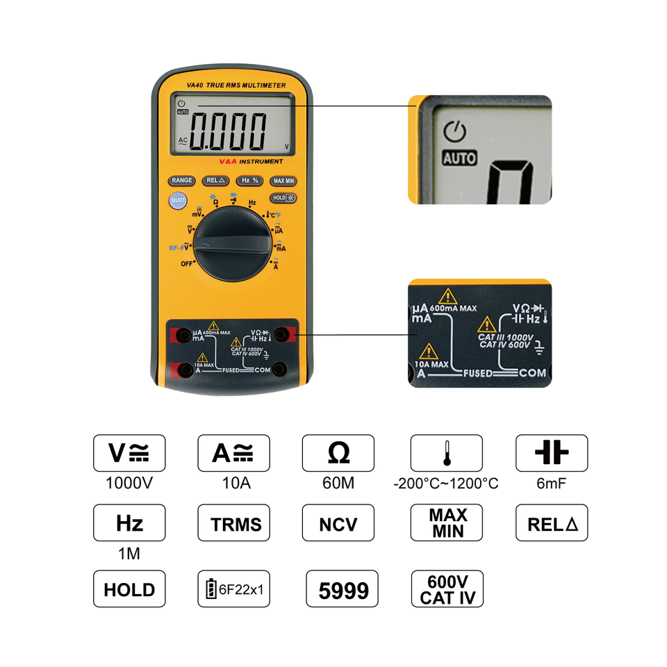 Multimètre numérique VA40 CAT IV à sélection automatique, testeur électrique 5999 affichages, NCV, Hz, Ohm, Capacité, Diode, Continuité, Rétroéclairage
