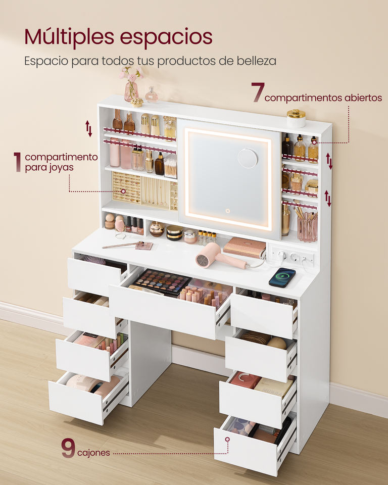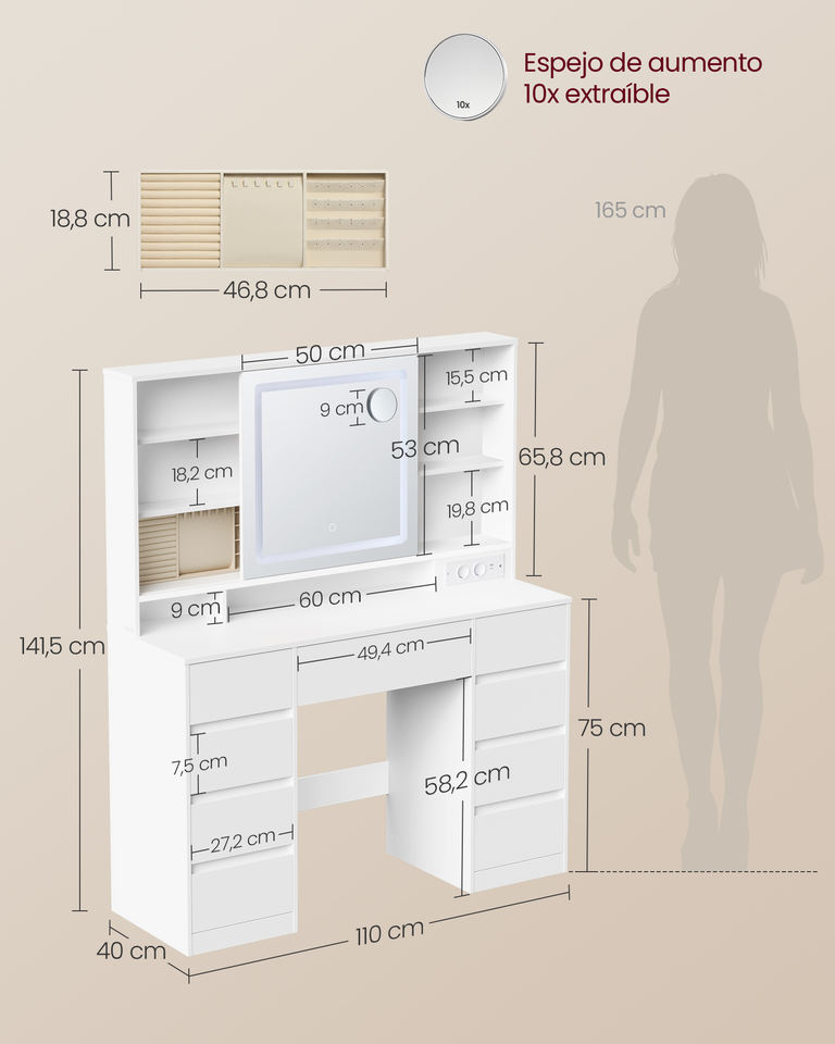 VASAGLE-Table de maquillage en bois à 9 tiroirs, commode blanche, lampe 3 couleurs, miroir grossissant 10x, coiffeuse avec miroir
