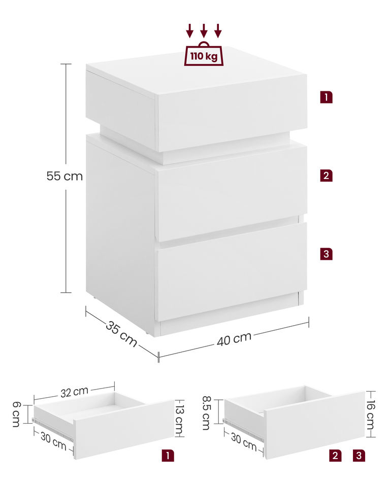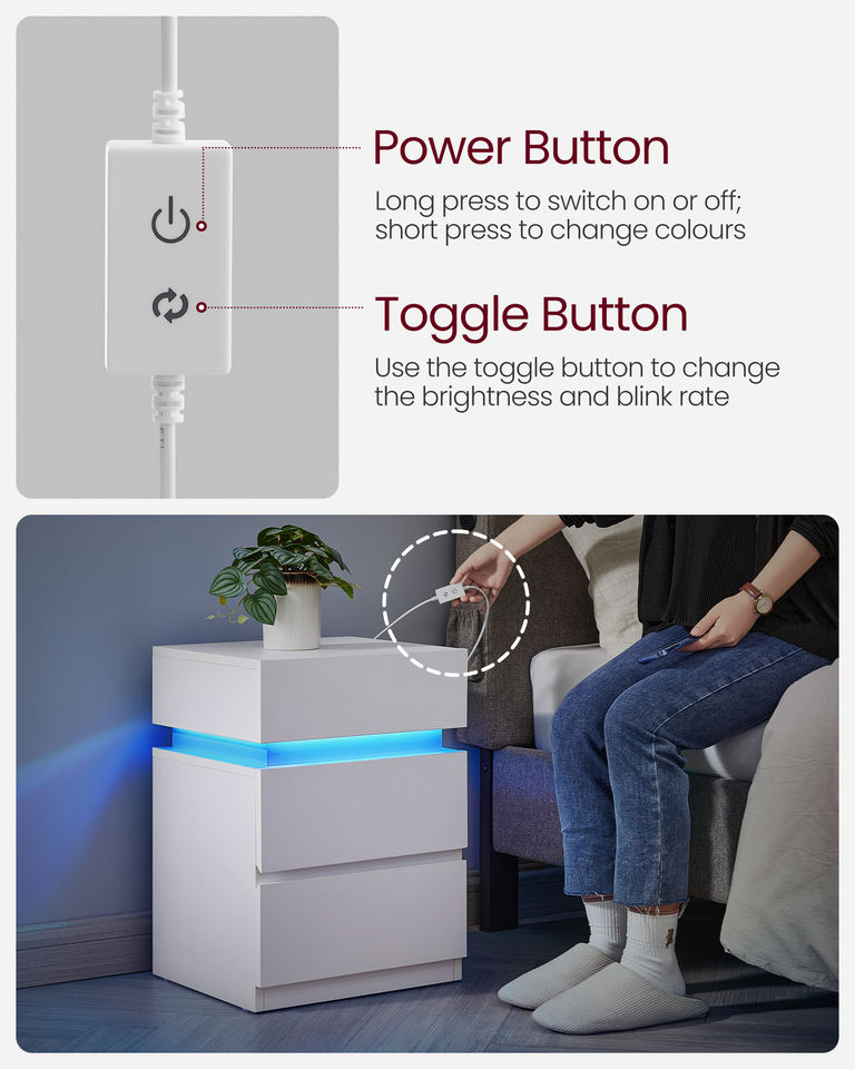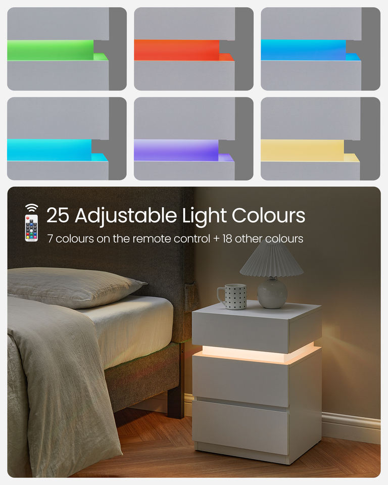 Table d'appoint VASAGLE à couleurs réglables avec 3 tiroirs pour chambre à coucher, salon, table de chevet intelligente éclairée, tables de nuit LED