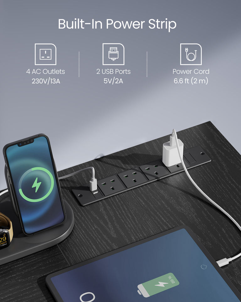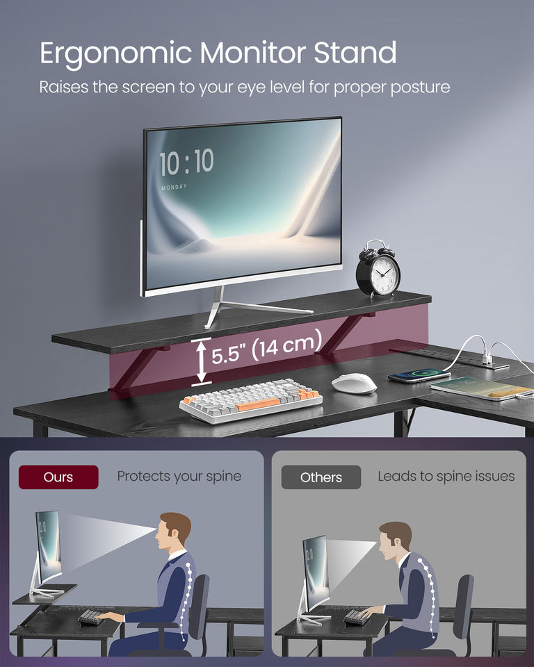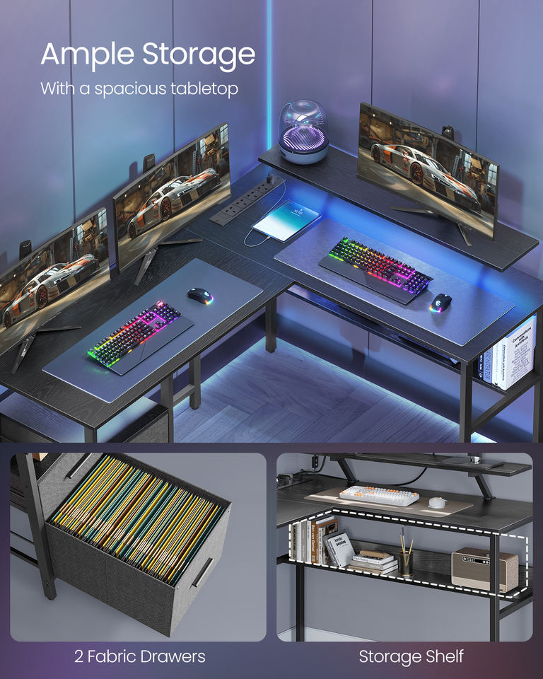 Bureau d'ordinateur en forme de L VASAGLE avec prises électriques pour bureau à domicile, bureau de jeu avec éclairage LED, 2 tiroirs, 2 ports USB
