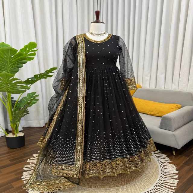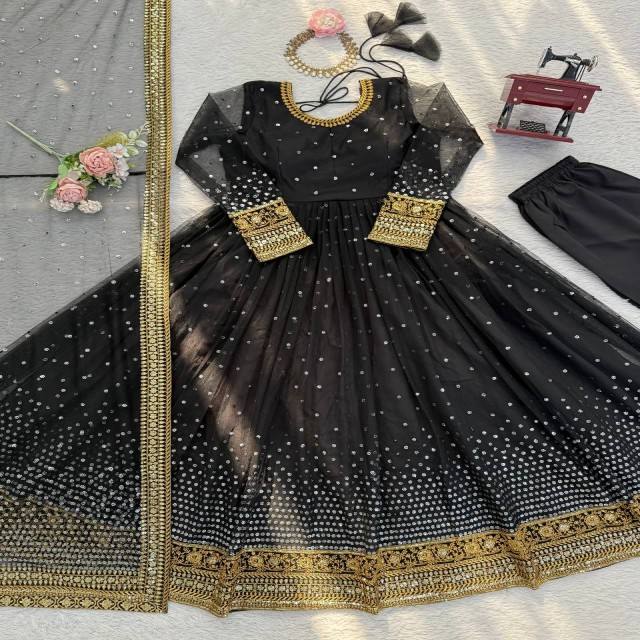 VASTRA COTTAGE Butterfly Net Anarkali Suit Set with Sequins Thread Work Pant Dupatta Elastic Waist Pant Festive Ethnic Wear